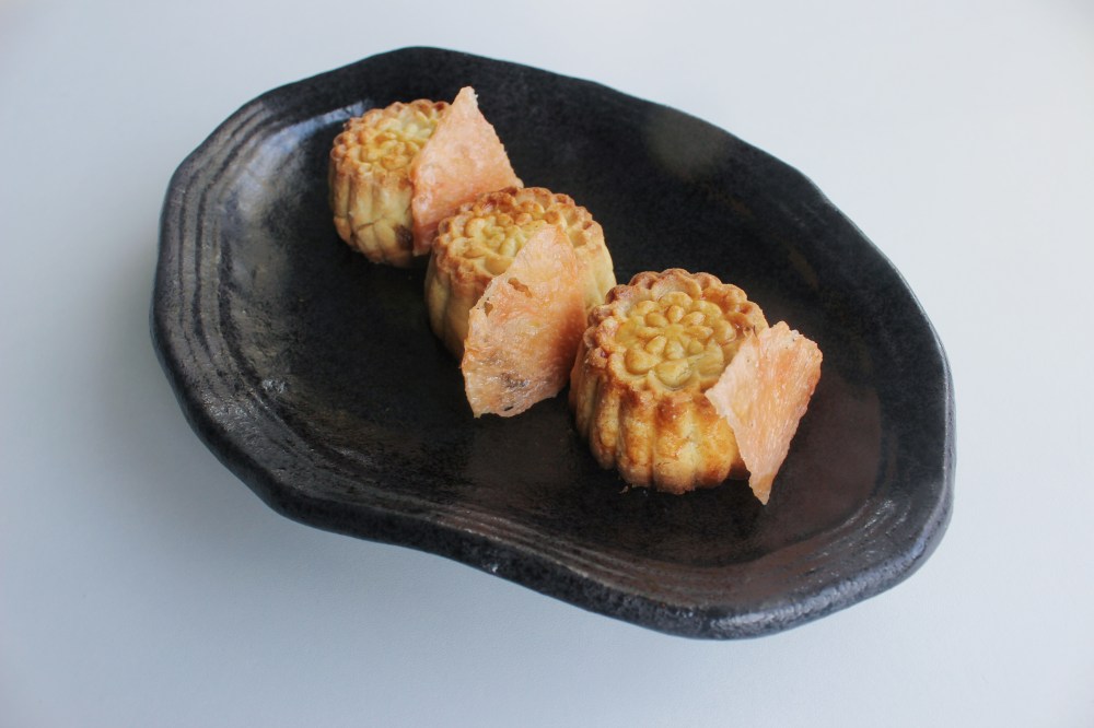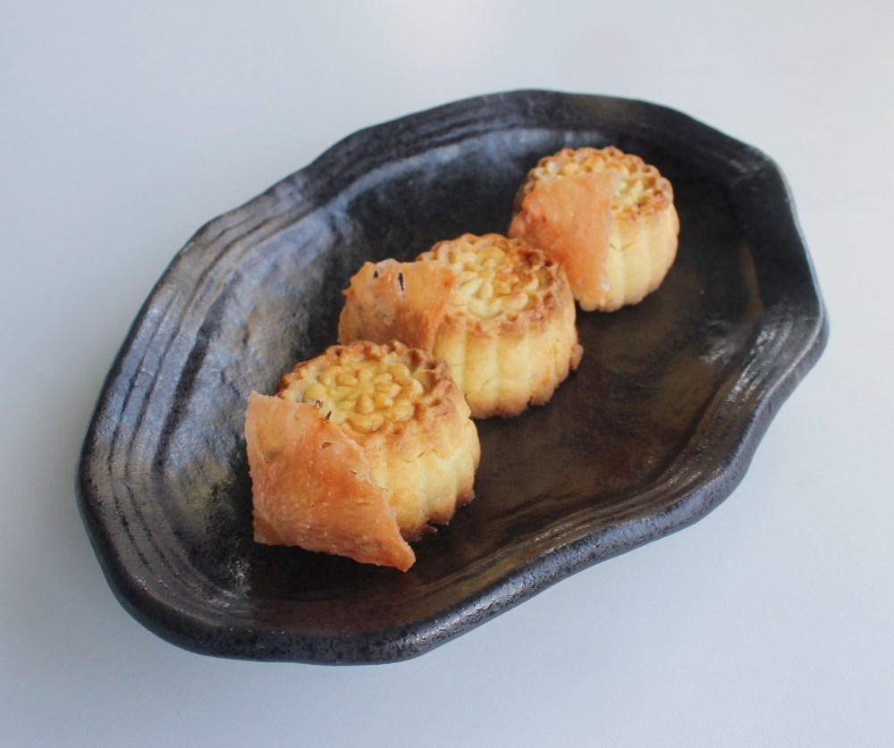 Gently fold the pastry around the fillings and seal the filling with the pastry completely. Gently press the pastries with a 1 1/2-inch moon cake press. Place these onto a lined sheet tray and brush the top with the egg white. Bake at 375 degrees F for 20 minutes. Allow the pastries to cool before transferring to a desired serving surface.
