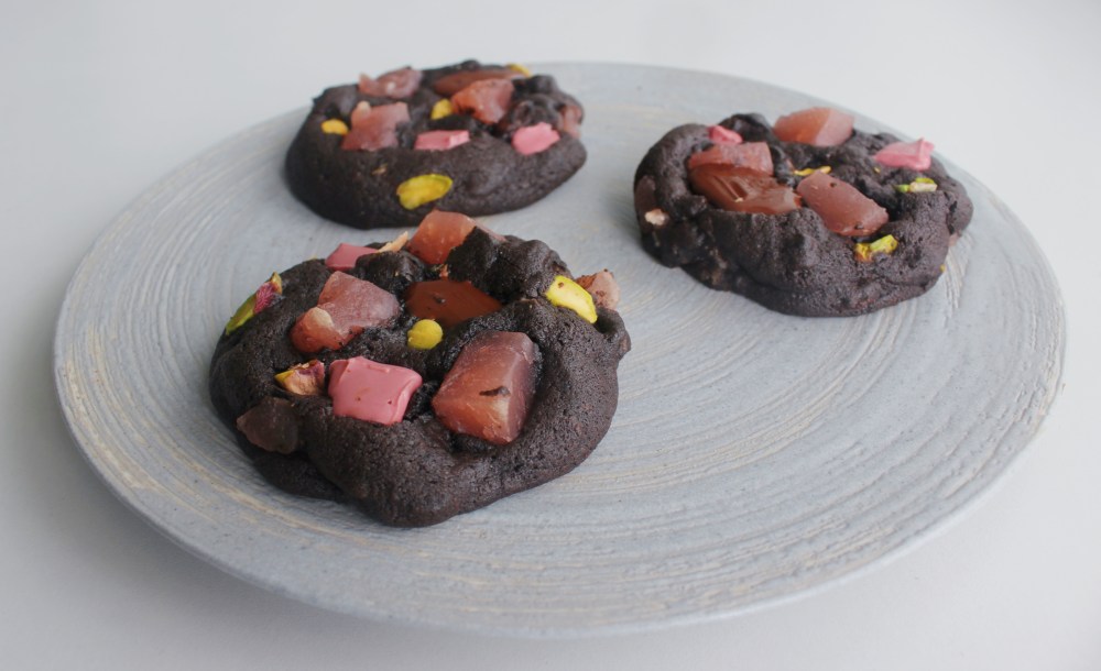 So I have made a version of these rose quartz cookies in the past, but I wanted to revisit the original recipe I made during my time at Milkbar, which featured a chocolate cookie embedded with Turkish delight(also called loukoumi, and they are like these sugary, pink rose-flavored jellies). The Turkish delight, which are primarily made from cornstarch, actually hold their shape really nicely in the baking process, and turn out looking like these gorgeous rose quartz crystals, sticking out the cookies themselves, all the while being rose flavored. Hence why calling these kinds of cookies “rose quartz cookies” makes sense, from both a visual and taste standpoint! The one thing that prevented the rose quartz cookies from being a true standout, to me anyways, was the texture. Turkish delight is soft and chewy, almost like a gummy candy texture, while the cookies themselves are soft and light as well. A cookie like this, to truly stand on its own, needs textural contrast. So I went back to the initial inspiration for these cookies, which was chocolate-Turkish delight ice cream. I love chocolate-Turkish delight ice cream and I usually eat that kind with pistachios and/or a semolina cake. I didn’t want to add semolina to my cookies, since the high gluten content would make the dough really tough and doughy, but the pistachios gave me an idea. So this time, I wanted to add some different ingredients, such as pistachios, dark chocolate, ruby chocolate, and a little bit of cardamom, just to really make these cookies a departure from the original, in both flavor and texture. The crunchy pistachios, and the crunchy chocolate would add what the cookie lacked. I also used ruby chocolate on top of dark chocolate, since it has a gorgeous pink color, pairs gorgeously with pistachio and rose, and adds a pleasant tartness that you might not expect in a cookie. I also scented the cookies with a little cardamom, since the floral notes of that spice would also enhance both the chocolate and the rose flavors.