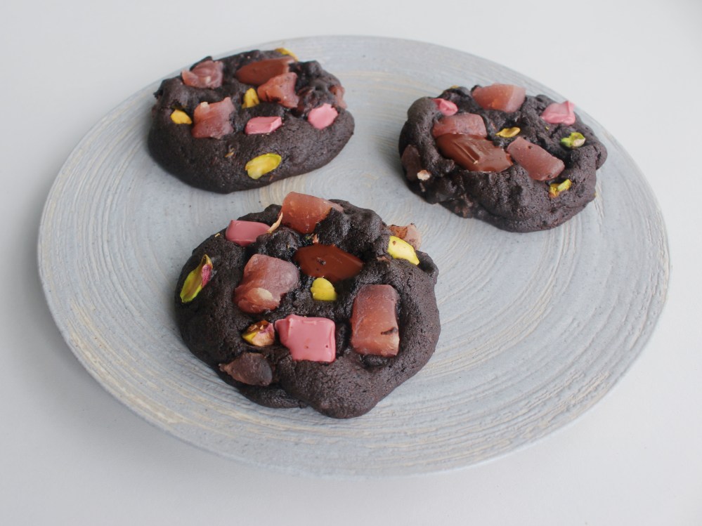 Garnish the tops of the cookies with a combination of cubes of dark chocolate, ruby chocolate, pistachio pieces, and finish with sea salt.