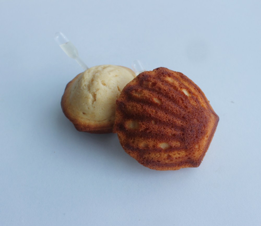 To break down everything further, the madeleine batter is made with ghee and milk powder, as a reference to gulab jamun being made with milk solids and fried with ghee. I brushed the pans with ghee as well, which caused the madeleines to bake off with this golden-brown color. I usually use more flour in my madeleine dough, but I found doing so, with the milk powder, caused the centers of the first batch I made of these to be too dry, even after I introduced the syrup to them. So, I omitted some of the flour to help with that. Also with madeleines, it is important that you rest that batter after you pipe it into the pans. Resting, and more specifically, refrigerating the madeleines will allow them to form this sort of skin on the side that isn’t attached to the pan, which when baked, creates that gorgeous hump you want to see in properly baked madeleines. Now for the syrup. I made the gulab jamun syrup in the traditional way, and I did a few things with it. I soaked the madeleines with several injections of the syrup, that way when you bite into them, they will have a very similar consistency to gulab jamun. I also served them with a pipet of the syrup, just so that you can make sure with each bite, you can drizzle on more as you eat the madeleine. These were a lot of fun to make overall, and are a good alternative to making actual gulab jamun!