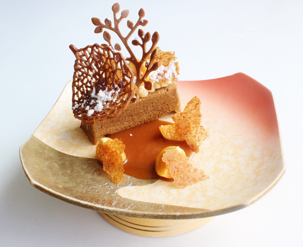 This was my submission for the Chef’s Roll x Kikkoman Soy Sauce Challenge! Basically the challenge was to make any dish that highlighted soy sauce, and the winner could win a $3000 cash prize or a trip to Japan. For me, the money would be nice, but I love Japan, and any excuse to go again would be(yes, I did just go in April 2023), so I was very happy to participate in this! I won’t lie, when I think of soy sauce and cooking, my immediate thoughts are to go either with a crudo, a sashimi dish, or something braised in the soy. When I think a little further, a dressing or a marinade come to mind too. But I knew that if I did any of those, it would be really predictable, and if anyone can use salty soy products in a dessert, it would be me. At least my track record with miso desserts permitting. So I started thinking about what I could do with soy sauce in general. Soy products like tofu, kinako, and soy milk are all super easy to utilize in a dessert, while also reinforcing that natural soy flavor. The thing about soy sauce is that yes, it is nutty, but it is also really smoky and salty. And on top of that, it immediately darkens the color of anything you add it to, so you will have to veer towards the brown side in terms of how your dish will look. To avoid making a giant salt bomb, using soy sauce judiciously is important, especially in a dessert. At the same time, I wanted this to be a dessert where the flavor profile completely changes/is complimented by the smokiness and saltiness. When I think of flavors that work well with smoke and salt, chocolate, caramel, almond, acorn, and tea come to mind right away. But I feel like chocolate is a copout, and it will completely mask the color of the soy sauce, and this is a soy sauce competition, so I wanted the color of the soy to really come through. So nixing the chocolate, that was kind of how I came up with the other flavors in this dessert, namely being caramel, almond, acorn, and tea. It was a really eclectic mix of flavors, but it works in a really autumnal way, which is the aesthetic I was going for with this dessert(on a personal level, I was manifesting being able to go to Japan in the fall with this prize, so that was what I wanted to plate up on a visual level).
