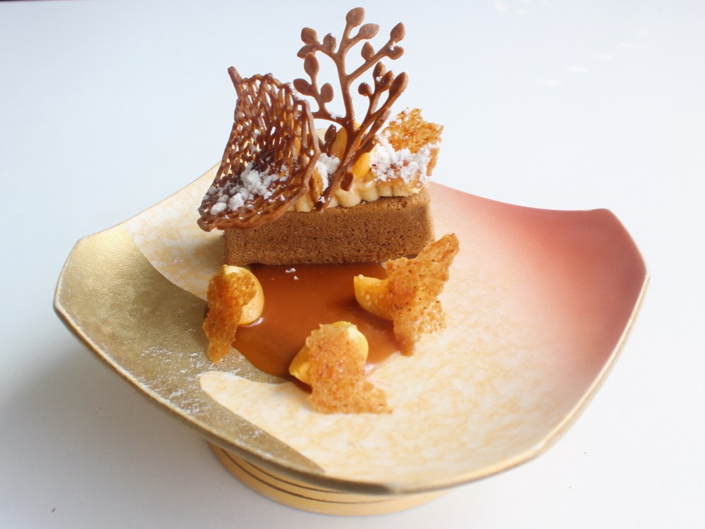 From a technical standpoint, I would grade this dessert probably a 9/10. The cremeaux is really unforgiving, being like a mix between a pastry cream and a chocolate mousse. There is so much fat in that cremeaux that it can overwhip and separate if you are not careful. So watch that like a hawk as you are doing every step. The financier is relatively easy if you own a stand mixer – the main thing is not to overmix the batter! The caramel and “snow” are also really easy components to make, but I will say, using a laser-pointed thermometer will make the caramel and the croquant steps infinitely easier. The croquant is a bit more technical, because like the caramel, it involves you heating up sugar to a certain temperature. But unlike the caramel, the croquant is poured over almonds, left to set, then blitzed into a find powder, sifted onto a baking sheet, and then baked into a thin caramelized wafer paper. It is delicious, and a great vehicle for the soy sauce, but it is time-consuming and after the cremeaux, the croquant is a close second in terms of technical difficulty. The tuiles are pretty straightforward, and if you have a Pavoni tuile stencil, they are super easy to make, and in pretty shapes too! Oh, and because I used only acorn flour, almond flour, and kinako(toasted soybean flour) in this dessert, it ends up being 100% gluten-free as well!