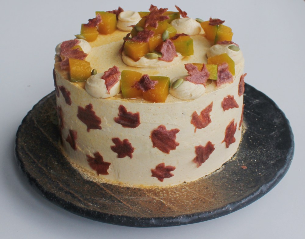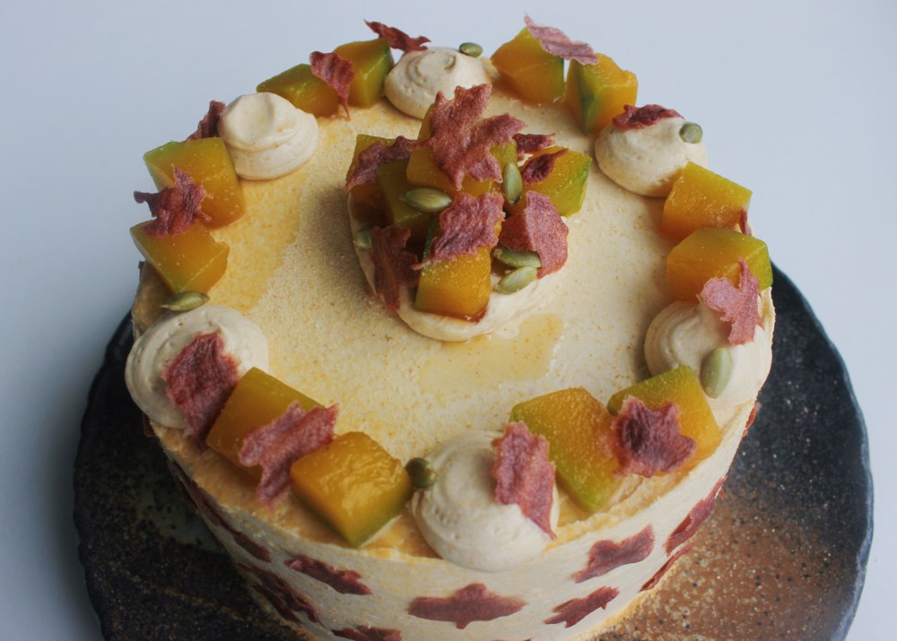 For the components, we have an acorn-kinako chiffon cake, maple-candied pumpkin, a maple-kinako French buttercream, and red acorn-maple tuiles. When it came to the ingredients, there I feel like maple might be the one people are the most familiar with. Maple syrup, or at least real maple syrup, has subtle earthy notes and a pleasant aroma to it. I love using maple in desserts, but I understand that real maple can be expensive, so you can sub it out with equal parts brown sugar with 1/4 tsp maple extract, or maple sugar! I also kept the price point of maple in mind, since it is a really pricy product, which is why I figured, rather than pouring out the maple poaching liquid I used for the pumpkin, I would rather recycle it into a bunch of the components, namely reducing it down into a soaking syrup for the chiffon cake and using the rest of it in the buttercream! The squash is being treated in a similar way to Mexican candied pumpkin(calabaza en tacha), in that it is being slowly braised in a dark, rich syrup. I did not use cinnamon in this recipe, just because cinnamon isn’t used commonly in Japanese desserts, and I wanted to keep this cake clean and true to that. Acorn flour/starch might be the one people are the least familiar with, but just treat it like flour, minus the gluten. I used xanthan gum as well as a more generous amount of brown butter compared to my usual chiffon cakes to help the cakes stay soft and not-dry. I opted to naturally dye my tuiles with beet powder, but you can also just use food coloring too. When it came to the tuiles, I used the same maple leaf stencil I used to spray my Maple langue de chaats, but you can use whichever stencils you can get ahold us – in the past, I literally would cut out leaf shape holes in card stock and just used that. The pepitas, or pumpkin seeds, are purely there for garnish, and you can 100% omit those if you want! I only have them handy in my pantry since I make lots of mole at home.