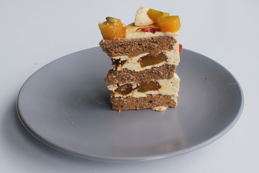 Start with one of your two normal rounds of cake, then pipe onto that about 2oz of the buttercream. Press in about 40% of the cubes of the candied pumpkin. Then repeat with the next layer of the cake, using the scrap layer for the middle. Place on the top layer, and spread a thin layer of the buttercream around the exterior of the cake – this will be a crumb coat to seal the cake into the frosting. Transfer the cake to the freezer for at least 1 hour.