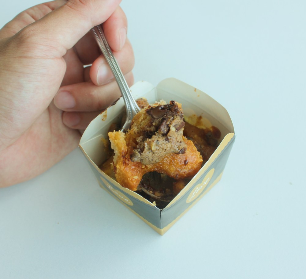 For the recipe itself, there are really three components. The bread, the custard, and a cookie dough that is baked on top of the bread pudding. I love the idea of streusel-types of dough baked with bread pudding to add another texture, so in this case, I went with a chocolate-walnut spice cookie, which adds that texture and a little crust on top of the bread pudding itself. The bread, I tossed with brown butter and toasted it, which guarantees that the bread will maintain its integrity when you soak it, and helps dry out the bread a little more so that it can soak in more of that delicious custard that we are pouring over it. The custard is probably the most difficult component from a technical standpoint. We start by making a caramel with just straight sugar, then we add in miso to season it, milk to break, then heavy cream to slowly thin it out to a liquid consistency. Then we add eggs to it to form the custard that we then soak our bread puddings for. I like to soak my bread in the custard for a relatively generous amount of time – at least 30 minutes, if not upwards to 24 hours – just to make sure that the bread is sufficiently soaked. The last thing you want is dry bread pieces in your pudding. For me, a good bread pudding should be buttery and silky in texture, with fluffy, French toast-like pieces of bread that are caramelized and crisped at the edges from being baked. The best way to accomplish that is by making sure your bread has soaked in enough of the custard so that it basically becomes an extension of it.