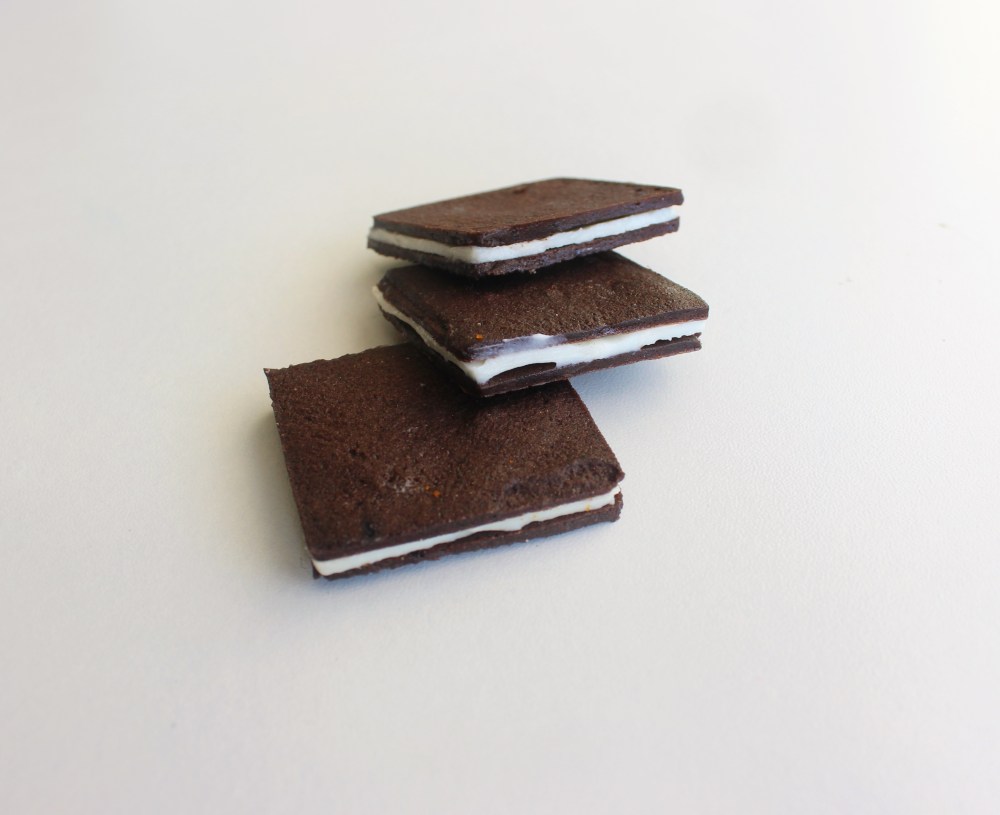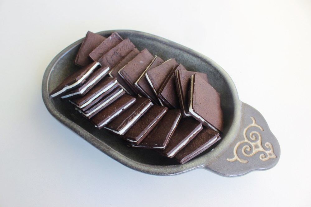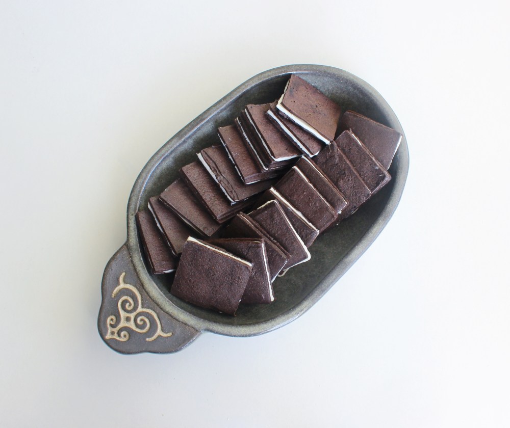 For the cookies, I made with them with essentially a batter, quite similar to a tuile batter, in that the cookies were formed by being spread over a stencil, then the stencil is removed, and the cookies are baked. I used black cacao in the cookie batter, since a. that’s what traditional Oreos use to achieve that rich, dark color, and b. because it is alkalized/Dutch-processed, the black cacao has this aromatic, fruity flavor to it that regular cocoa powder lacks. The cookies, being so thin, can burn quite quickly, so do not try baking them for any longer than 8 minutes at 400 degrees F. With the filling, this is where I will admit 90% of my R&D went into. I went with a white chocolate-cream cheese filling. The challenges with that kind of filling would be the white chocolate. Because of how much sugar and fat exists in white chocolate, it has difficulty firming up/freezing solid(which is what you need in a langue de chaat filling so that they retain a flat, square shape that makes assembling these cookie sandwiches way easier). When I first attempted to make the filling, which also involved me spreading it through a stencil, and freezing squares of the filling solid, they stayed solid for maybe 1 minute before turning soft. I found that adding a lot more butter ended up emulsifying with the white chocolate, and allowing it to freeze more solid, which I adjusted for in this recipe. I also used silpat originally for the fillings, but cooking spray-lined parchment worked way better for transferring the frozen squares of filling between each cookie. With those tips in mind, if you are craving an Oreo-flavored sandwich cookie that isn’t an Oreo, you should totally try this recipe out!