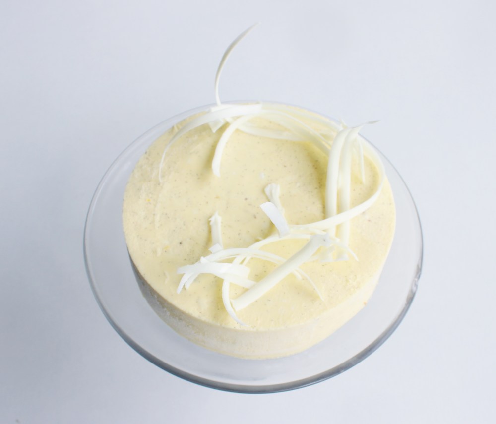 Over a double boiler, melt 2/3 of the white chocolate completely. Take the melted chocolate off heat and stir in the rest of the white chocolate until that is melted in as well. Pour the chocolate onto acetate and using a ridged bench scraper(I got mine from the paint supplies section in Blik!), scrape the chocolate to form thin rows. Curl the acetate and refrigerate it until it solidifies and can be removed from the sheet. Garnish the tops of the cake with the curls.