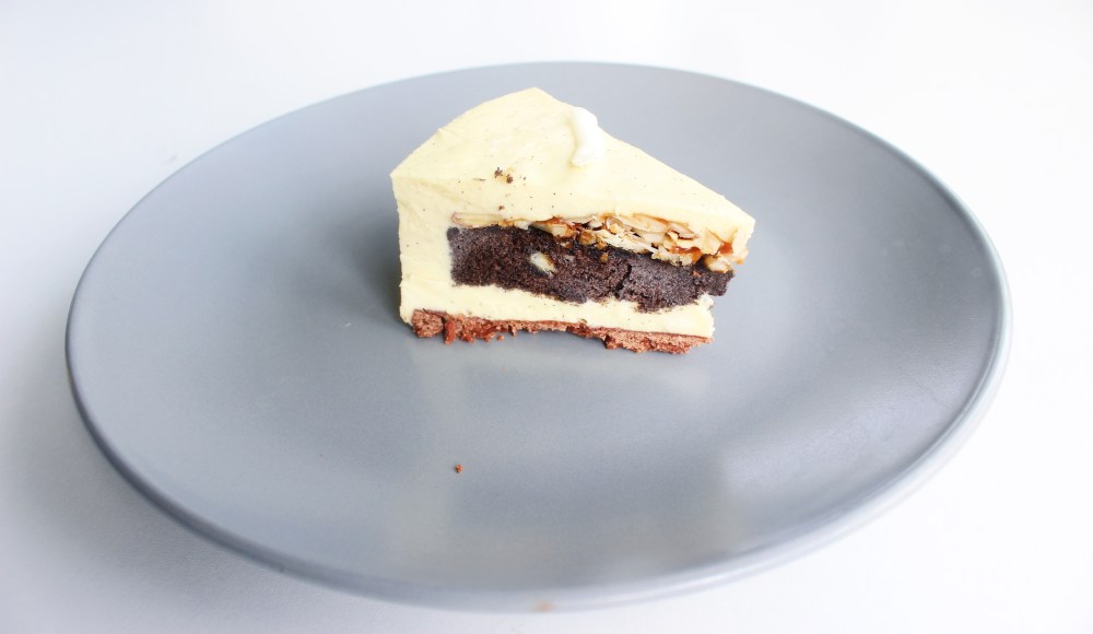 Line a 6-inch ring mold with cooking spray and pull cling wrap against one side of mold. Pour half of the mousse base into the mold, and then press into that the cake. Then add in the rest of the mousse base, and then press in the shortbread crust. Freeze the cake solid, at least 2 hours, before attempting to unmold.