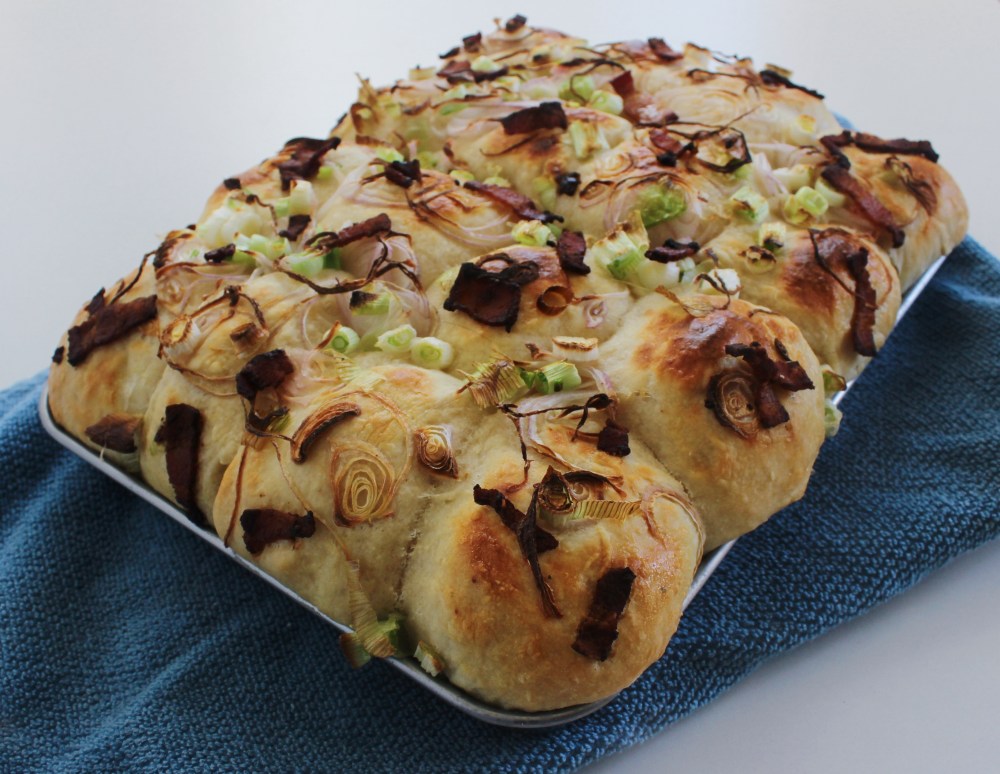 Line a quarter baking pan with cooking spray. Place each ball of frozen filling into each piece of dough and gently wrap the dough around the filling, pinching and closing any seams to make sure that the dough is completely enrobing the filling. Place each dough ball into the quarter sheet. Brush the top of the dough with beaten egg, and sprinkle on top of that the green onion, shallot, and bacon. Bake at 375 degrees F for 40 minutes.