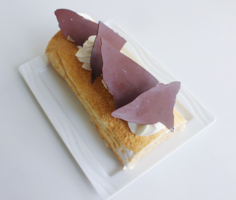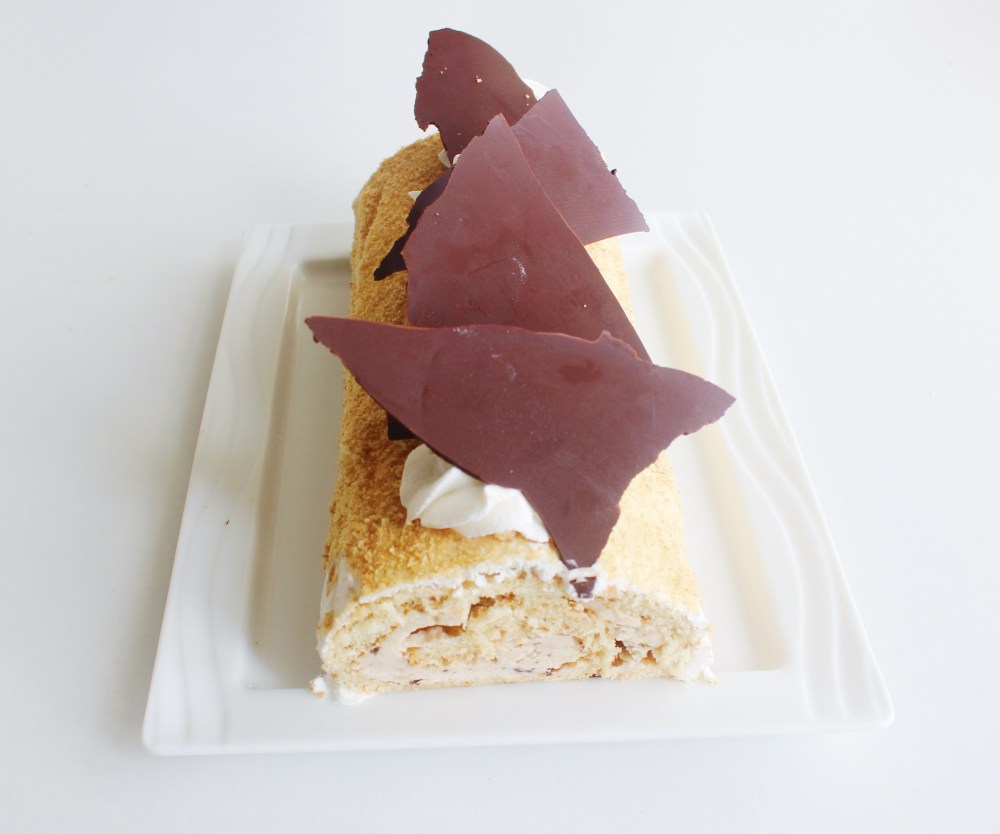 Pipe the remaining decorative cream on top of the cake, and garnish the top with the chocolate shards. Trim the ends to reveal the spiral pattern of the cake.