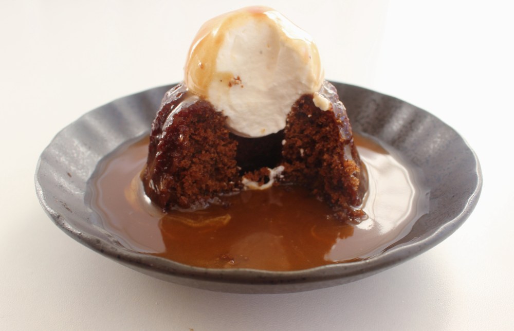 Start with portioning about roughly 1.5oz of the toffee sauce into pouring glasses. On a plate, place down the cakes and a scoop of cream. Pour on the toffee to serve.