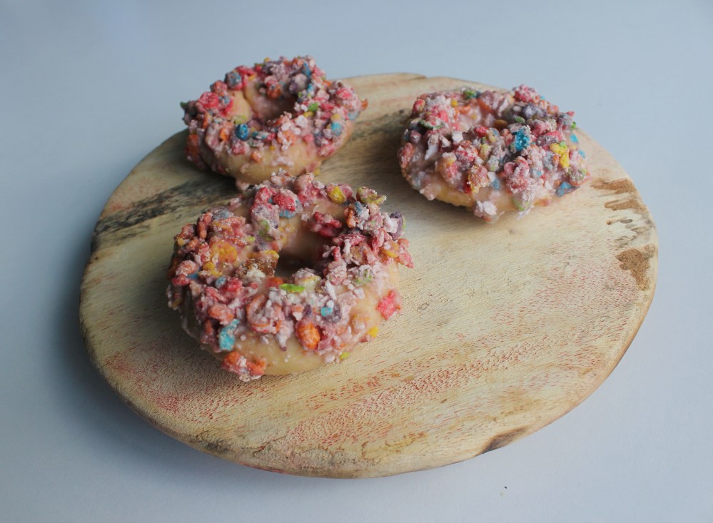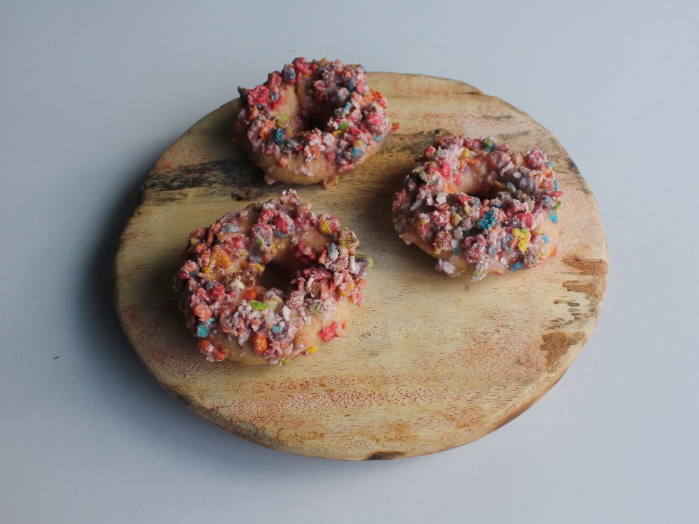 Dip the cooled down doughnuts into the glaze, then press into the Fruity Pebble-ruby chocolate crunchies, and then place onto an icing rack, allowing any excess glaze to drip off.