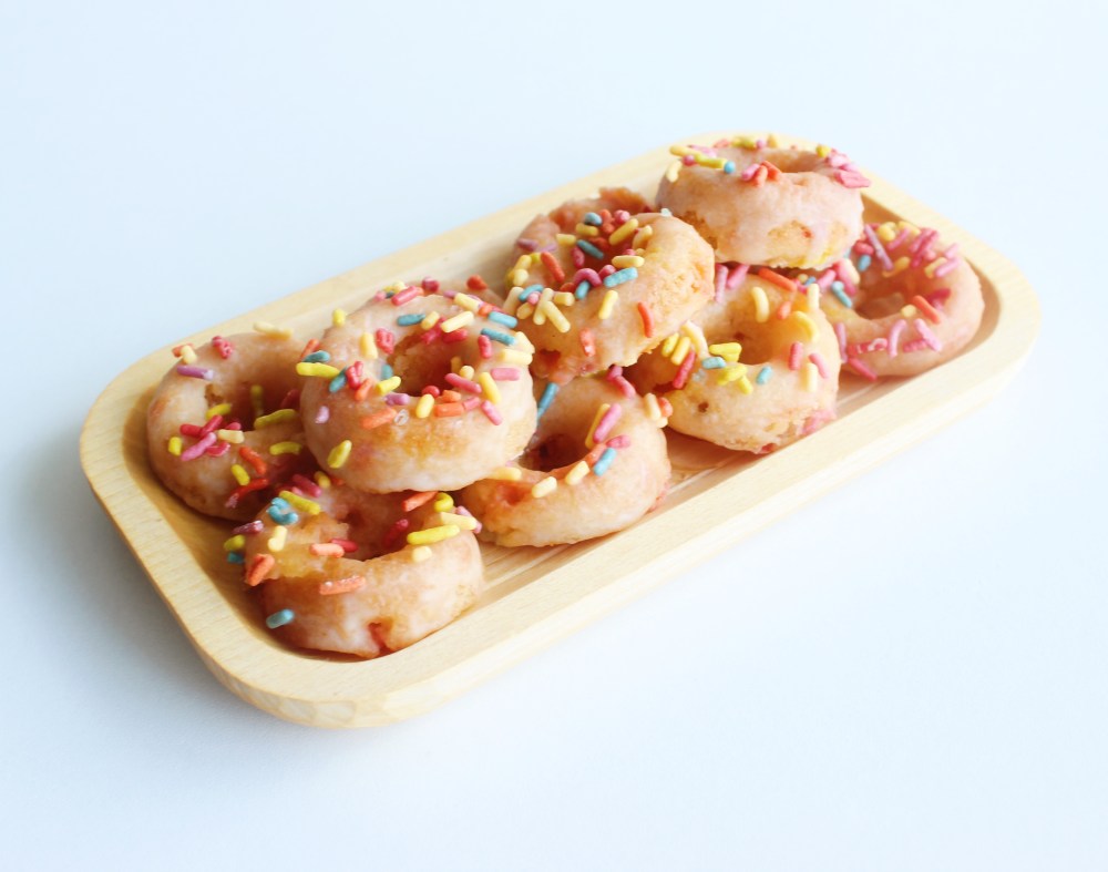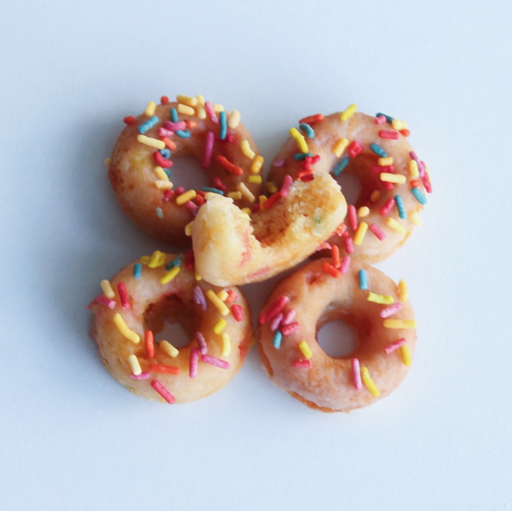 In a bowl, whisk the cornflakes, sugar, vanilla, oil, and vinegar together until combined and completely smooth – you do not want lumps of cornflake in there. Sift the flour, baking soda, and salt together and toss the sprinkles through that. Fold the flour mixture into the cornflake mixture to form your batter. Transfer to the batter to a piping bag. Line 3 mini doughnut baking tins with cooking spray and pipe your batter into each one. Bake the doughnuts at 375 degrees F for 8 minutes. Allow them to cool slightly before carefully removing them from the tin, using a spoon to help as necessary.