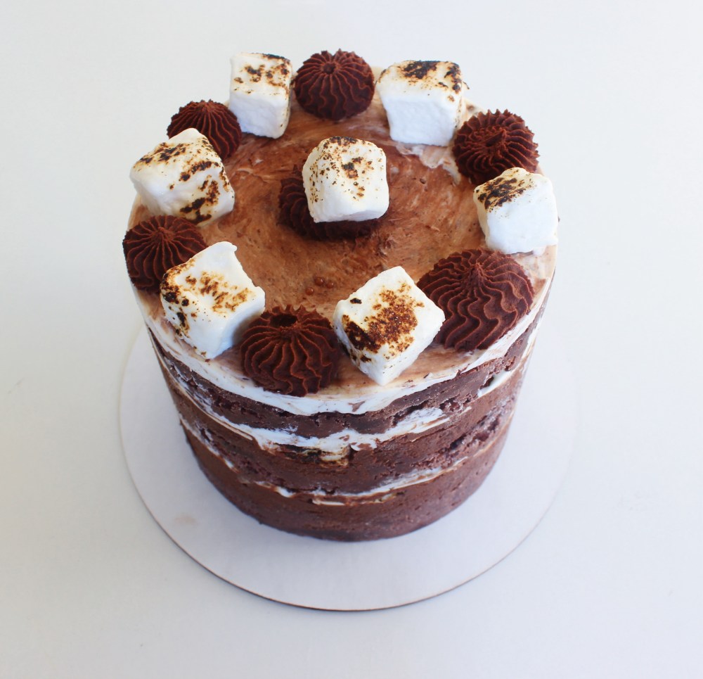 For the components, we have an Ovaltine chocolate cake, whipped chocolate ganache, cocoa soak, Swiss meringue buttercream, and toasted marshmallows. If you want to use premade marshmallows to save time, you totally can, and this recipe’s difficulty goes from a 7/10 to a 5/10, but I prefer homemade marshmallows because they have this springiness that the storebought ones lack. That and I prefer a square-shaped marshmallow. It looks more elegant, especially after being hit with a blowtorch. The marshmallows require time in the freezer for them to set up, and it is a potentially messy process, since they are super sticky. Using a stand mixer to whip the marshmallows makes for an even easier time, so keep that in mind as you approach this recipe. The cake itself is my signature chocolate cake batter, which comes together really easily. It’s hard for me to believe that I have been using that cake recipe now for the past 14 years, but time flies when you’re having fun! The ganache buttercream comes together with a little patience, since you are first melting, then chilling, and finally, whipping the chocolate into a soft, mousse-like texture. The other buttercream, the Swiss meringue, that is probably the most technical. You have to take egg whites, whisk them with sugar over a double boiler to pasteurize them(aka remove any risk of salmonella by cooking the egg whites to 140 degrees F) and dissolve the sugar granules, then whip that into a Swiss meringue. The meringue is then mixed with softened butter until everything emulsifies into a buttercream. The challenges here include getting the egg whites to the right temperature, whipping up the meringue, and making sure that the butter and egg whites whip together long enough to form a smooth buttercream. The thing about meringue buttercreams is that when you mix butter into the meringue, the mixture initially will split and look kind of like congealed baby vomit. But as you whip the deflated meringue and the butter chunks together, they will gradually meld together into a smooth, silky buttercream that tastes like ice cream! I would say that the marshmallows, followed by the meringue buttercream, are the two hardest parts of this recipe, but if you own either a stand mixer or an electronic hand mixer, this recipe becomes dramatically easier!