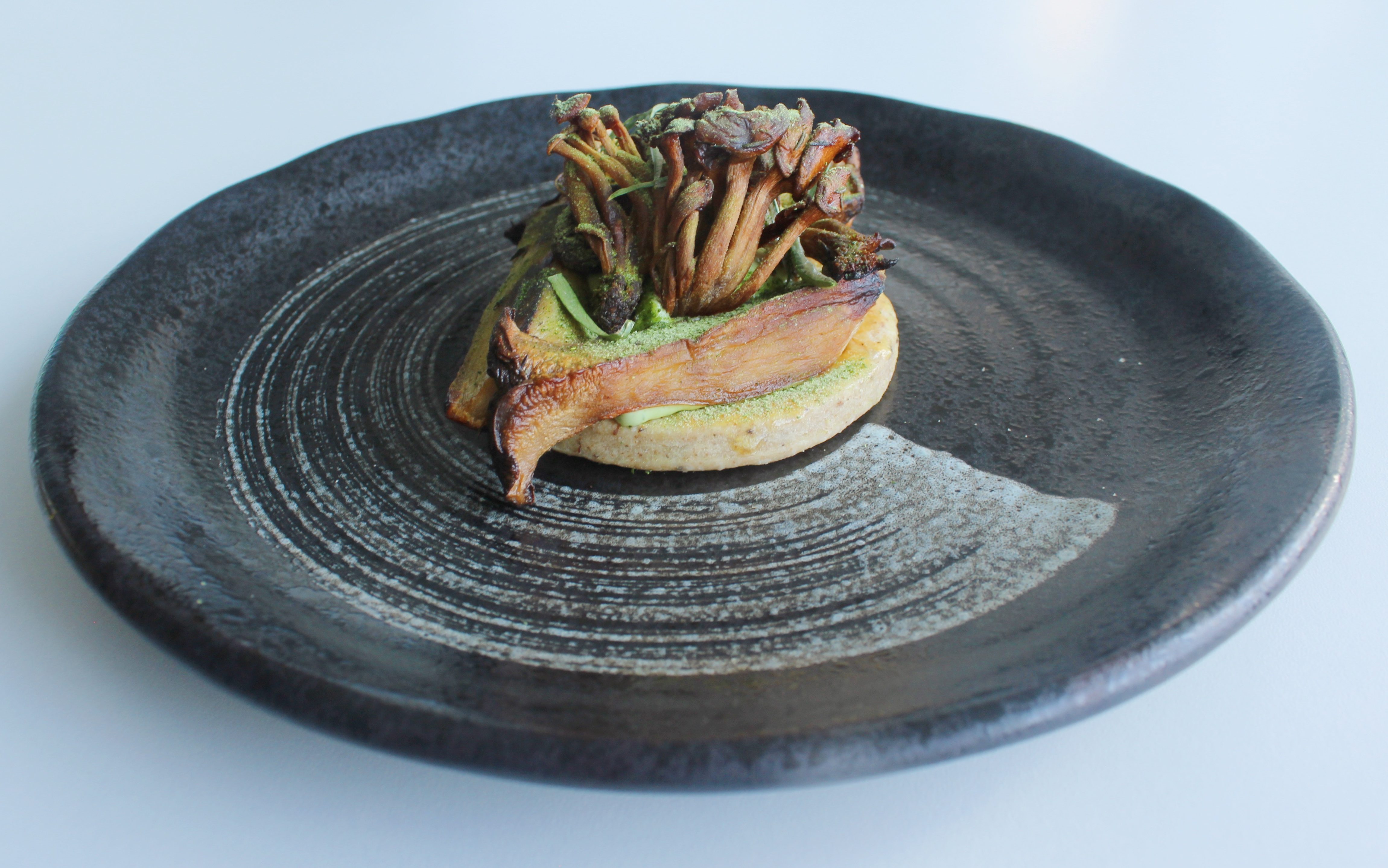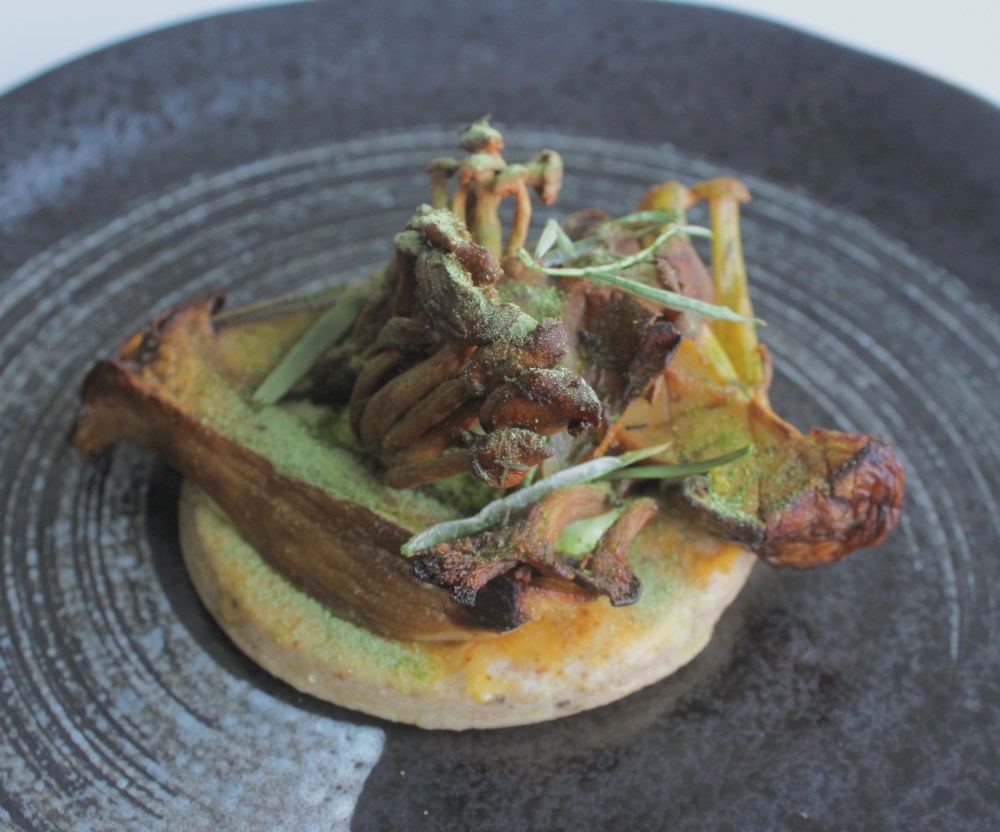 Start by piping on the tarragon-matcha mascarpone onto the top of the baked shortbread. Garnish the sides of the mascarpone with the roasted mushrooms, the top with the air-fried, and finish with a dusting the tarragon-matcha salt and leaves of the microwaved tarragon to finish.