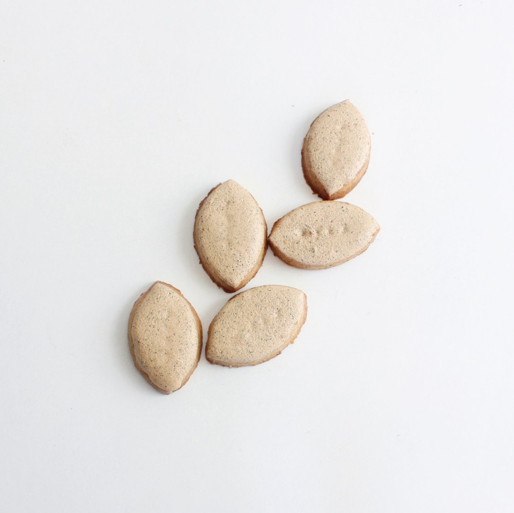 With the cookies, I went with the shape of the French confection, calissons! Calissons are these ovular shaped pieces of almond paste that are finished with a thin layer of icing on top. I like how elegant and dainty the shape of those are, and wanted to replicate a similar aesthetic for my cookies! The cookies are made from a shortbread dough that uses the hojicha miso sugar, while the icing is a royal icing made with the same sugar. Things to note include the sugar itself – it is important to roast the miso paste in the oven until it can be cleanly peeled off of the baking sheet. If the miso is wet, then it will cause the miso-hojicha sugar to turn into a muddy mixture instead of a fine powder. The shortbread dough itself can be made easily by hand, and even easier by food processor. The icing is a royal icing, meaning it is made with whipped egg whites and sugar. This not only uses the leftover egg white when you use the egg yolk for the dough, but also creates a crunchier glaze on the finished cookie itself. Since raw egg whites can be salmonella-prone, I pasteurize the egg white on a double boiler with the sugar first to kill off those germs. The glaze itself does form a nice shell on the exterior of the cookie, but if you find that the glaze does not set up in 10 minutes after dipping the cookies into it, just bake the glazed cookies on 250 degrees F for 10 minutes, and that should set it up.