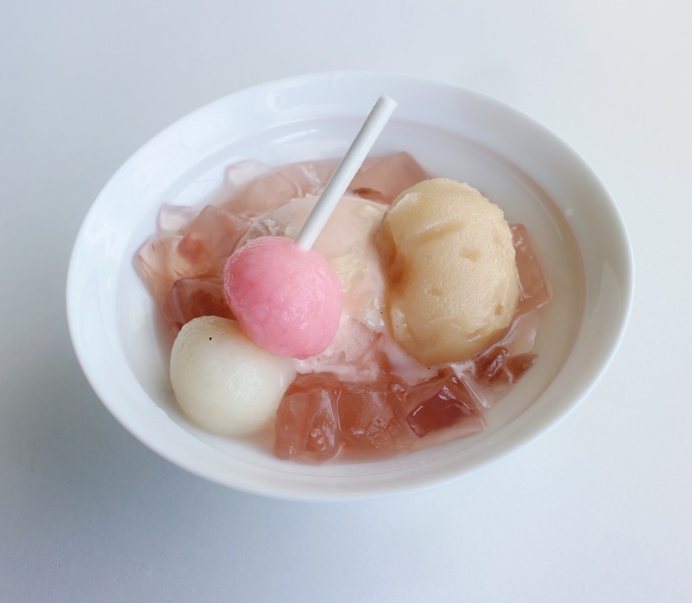 Start with a scoop of the ice cream first, then garnish the sides with the gelee. Place a scoop of the shiro-an on top and garnish with the dango skewer to finish.