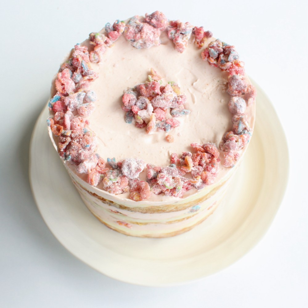 This cake was the result of me craving Fruity Pebbles, and trying to figure out a more technical, gourmet way to consume them. There is just something about Fruity Pebbles, probably the artificial citric acid taste and the crunchy texture, that I just crave from time to time. And no, this is not a sponsored recipe, although if Fruity Pebbles does want to pay me, I would not be against that either. I love the idea of doing a cereal milk, infusing the Fruity Pebbles into the milk instead of cornflakes, so I centered a lot of the recipe around that idea. Unfortunately, because of all of the colors in Fruity Pebbles, steeping that into milk results in the milk turning this unappetizing gray color. When I think of Fruity Pebbles cereal milk, I would assume that it would either be a white colored milk with colorful speckles in it, or maybe a lightly pink colored milk. Sadly, reality decided to make it so that a cereal milk made from them looks like if you liquified Roger the alien from American Dad. To counteract that, we are using the soak in cake batter, which will result in a slightly more appetizing yellow color, and using some pink food coloring to transform some of the grey soak into a delicate pink-tinted Hermine buttercream. And to play on the citric acid artificial fruity flavor, we are using two other ingredients – limes and ruby chocolate. Lemons can work here too, but I used limes because my amazing friend Sylvie gifted me with about 10 of them(thanks Sylvie and Sylvie’s lime tree-owning coworker!), so using the limes in this recipe actually made a lot of sense. The reason why I am calling this a “Dreamsicle” cake is a reference to a creamsicle, which normally uses orange and vanilla cream, but in this case, it is limes and Fruity Pebble cereal milk!