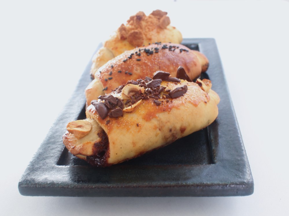 Divide the dough into 15 pieces. Roll each piece out to be a vaguely triangular shape. Spread onto each piece either the black sesame paste, Biscoff spread, or Nutella. On the wide side, place on a tbsp of butter. Roll the dough up, in the same fashion of a croissant. Let the breads sit at room temperature, 3 inches apart on lined sheet trays, for 2 hours. Then brush the tops with a beaten egg yolk and sprinkle the garnishes on top. Bake the shio pan at 375 degrees F for 22 minutes.