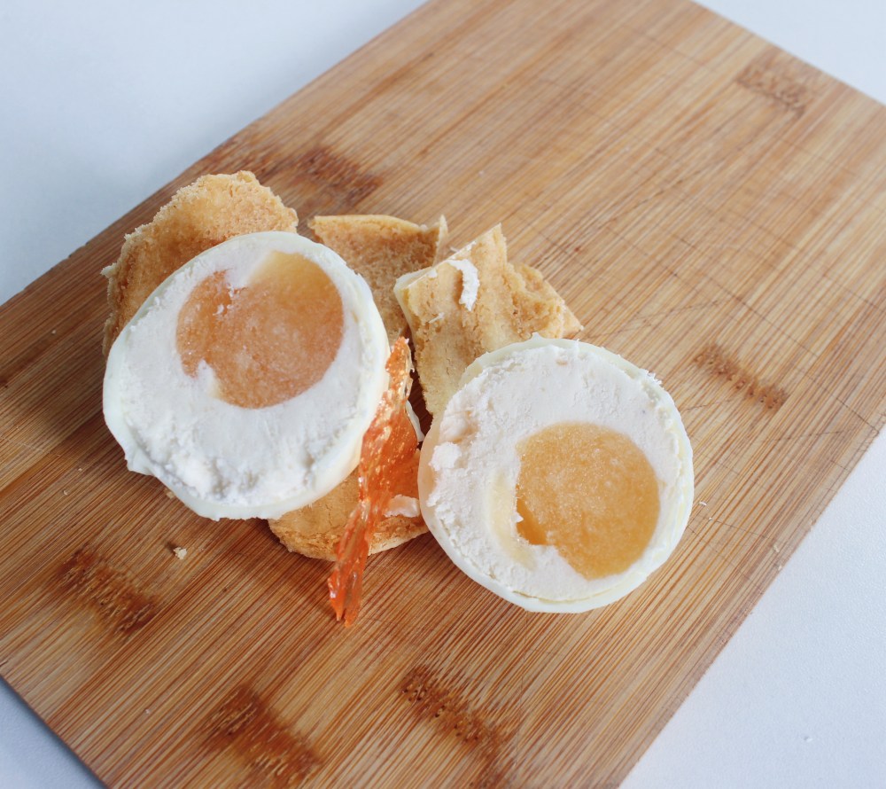 In terms of order of operations, I recommend making the liquid core first, and then when that is frozen solid, then work on your mousse. With the shortbreads, they can be fragile since we used coconut flour to bring in a more concentrated coconut flour, so I did brush the exterior of the cookies with some leftover white chocolate shell just to keep the shortbreads stable. The white chocolate shell is a take on the magic chocolate shell, made by melting down white chocolate with coconut oil and using that to both coat the frozen POG mousses and to coat the shortbreads. The bubble sugar, I wish I could have used POG juice in it, but I found that the additional things from POG juice caused the sugar to burn before it could set, so I had to default to using regular sugar to just get that coral-like pink sugar garnish made. At the least, I can assure you that this dessert does not run the risk of being too sweet, as the core and mousse being unsweetened balance it all out!