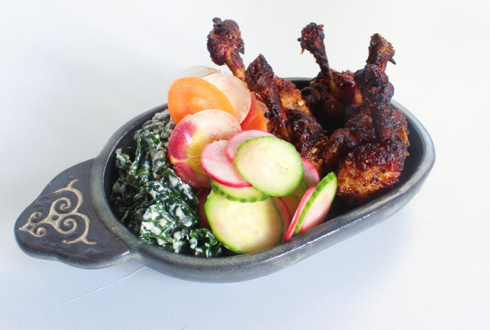 Toss the kale with the dressing. Toss the wings with the chili crisp. To plate, start with the kale-slaw, and garnish on top with the shaved rainbow carrots and the pickled vegetables. Offsetting that will be the chili crisp wings.
