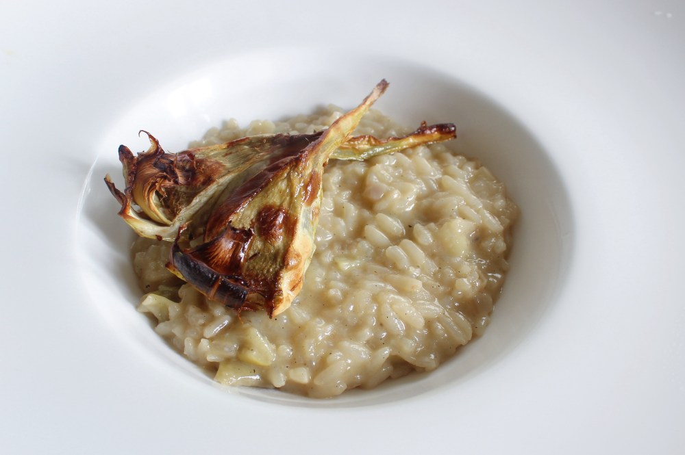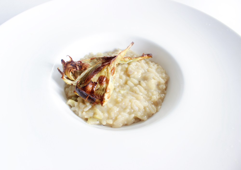 In a large and deep pan, heat up the olive oil with shallot, garlic, and salt. Sweat out the shallots, and once translucent, remove them and the garlic from the pan. Repeat this step, but with the artichoke hearts, cooking them until they begin to brown. Remove the hearts and add in your rice. Stir the rice in the pan on medium heat until it begins to turn translucent as well, then add in the shallots, garlic, and artichokes. Stir those through and first add in the cooking sake, stirring that all together for 1-2 minutes on medium heat first. Then add to that 4oz of the artichoke stock, stirring the rice frequently again. Stir the rice on medium heat for 3-4 minutes, allowing the liquid to almost fully cook down before adding in another 4oz of the stock. Repeat the steps of stirring, reducing, and adding more stock into the rice on medium heat until the rice is fully cooked – the grains should not be white in the middle. At this point, add in the pecorino and stir until the cheese is fully melted into the rice.