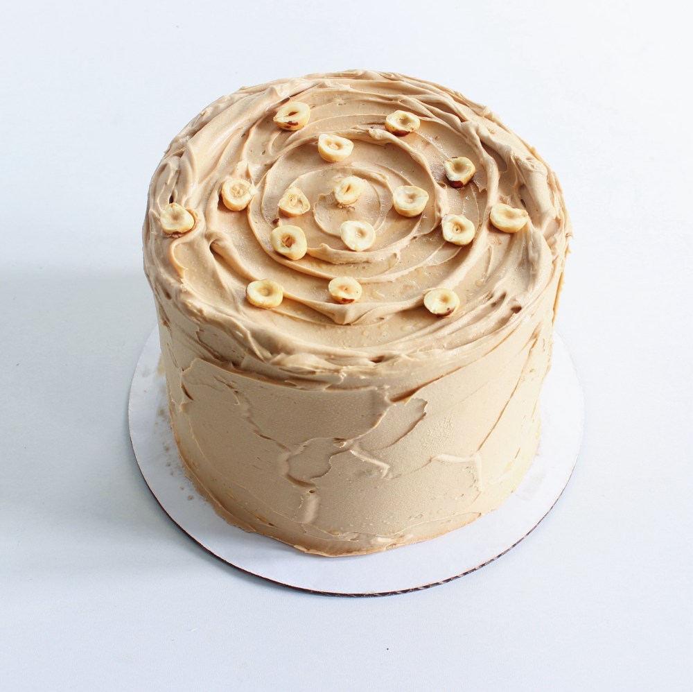 Place down a round of cake and sprinkle on 1/3 of the soak. Spread roughly 2oz of the buttercream onto the round in a smooth, even layer, then sprinkle onto that half of the Toffiffee pieces. Repeat these steps with the next layer of cake. For the final layer, apply on the soak first, then spread 1oz of the buttercream on top of the cake. Transfer the cake to the freezer for 10 minutes to allow the buttercream to firm up. Then spread the remaining buttercream around the cake, using an offset spatula or a bench scraper to flatten the buttercream/cover any exposed pieces of cake. Optionally, you can swipe along the buttercream with an offset spatula to give a more wavy finish to the buttercream itself. Garnish the top with hazelnut pieces to finish.