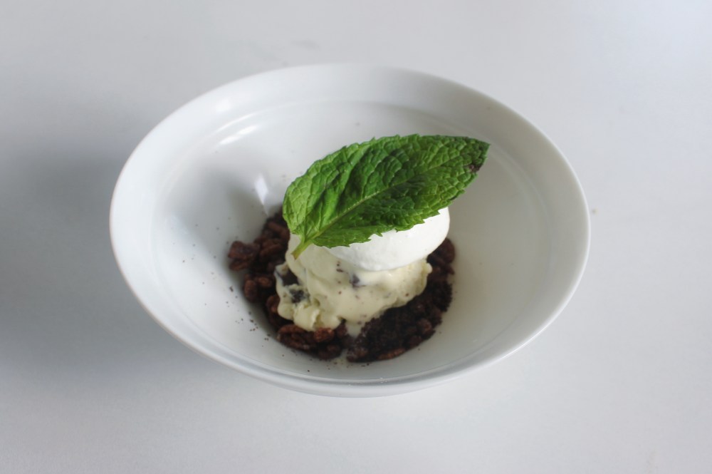 In a bowl, mix the Cocoa Krispies, crunchy chocolate balls, and cacao nibs together. Place that onto the bottom of a bowl, and place on top of that a scoop of the gelato. Pipe a dollop of the cream on top of that, and garnish with the mint leaves to finish.