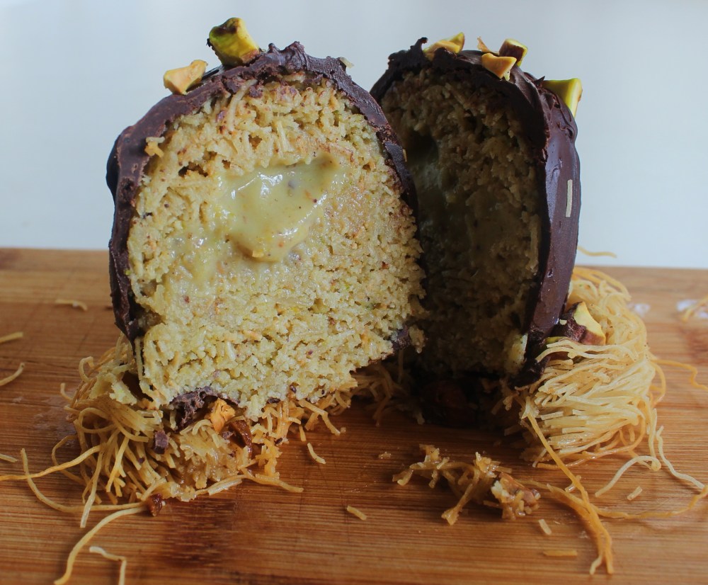 About a year ago, I had on my to-make list to do a knafeh-themed dessert, but where there was going to be an egg motif going on, with the kataifi(also called shredded phyllo) being used as like a nest around this knafeh-egg-thing. I never got around to doing it because life happened(i.e. my now ex-workplace started forcing me to work 12 to 14-hour work days and I literally had no time to do anything I wanted until I finally got settled in to a new job where hopefully that will never happen again), but what re-ignited my interest in attempting this was seeing the viral Dubai Chocolate bar. The chocolate bar consisted of a mixture of pistachio cream folded in with toasted kataifi(shredded filo) and then stuffed into a dark chocolate shell to form your chocolate bar. I saw about 10 different videos of people making these, and then realized that this would be the perfect concept to bring back that knafeh egg idea with! The knafeh egg was going to use pistachio, rose, cheese, and kataifi, but in this case, we are swapping out the rose and cheese with chocolate, and it still is a very similar format to what I initially had in mind. Hilariously, a lot of people were calling this kataifi and pistachio paste-filled chocolate bar a knafeh-flavored chocolate bar, which is not necessarily true, since knafeh is more about the rose syrup and the cheese than it is just about the pistachio and kataifi, but I can see where the knafeh influences come from. That being said, this was still a great launching point for a fun take on the viral chocolate bar recipe!