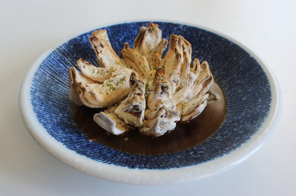 For the components, we have a caramelized onion jus. Think French onion soup, but using mirin instead of cognac, so it is like a Japanese onion soup. The key here is to slowly cook the onions down so that the sugars have time to caramelize before you add the liquids to layer in more flavor. By doing that, your sauce will have this rich, sweet flavor to it that is highly reminiscent of a French onion soup. I used dried koji and soy sauce in the making of this recipe, because I wanted the jus to have this deep, rich flavor and a pronounced umami to play off of the sweetness of the onion. The end result did taste like if soba tsuyu(rich dark dipping sauce) had a baby with French onion soup. And I loved every sip of it. With the blooming onion itself, there is first a marinating process, which is done to draw out some of the funkier onion notes as well as tenderize the actual onion itself. The onion is then dusted with mochiko and cornstarch, then air-fried to get it crispy. Just to add a little greenness, since this is otherwise brown on more brown, I microwaved some parsley and crushed it into a fine green powder, which I sprinkled over the blooming onion to give it a pleasant almost mossy-looking finish. This recipe is a great way to use up any onions you are meaning to get rid of, since onion is being used in both the sauce and as the star of the dish!