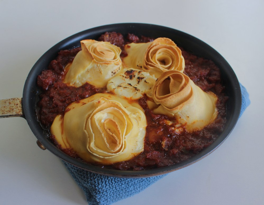 Spread the filling on top of each rectangle of pasta and then roll them up into little wheels. Cut each wheel in half width-wise. Place down the bolognese sauce in a layer in either a shallow baking pan or an oven-proof pan. Place down the pasta on top of that, cross section sides facing up and down, and bake everything together at 400 degrees F for 15-20 minutes.