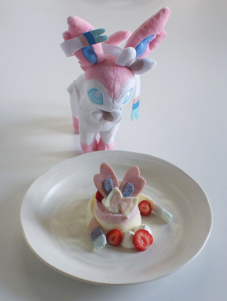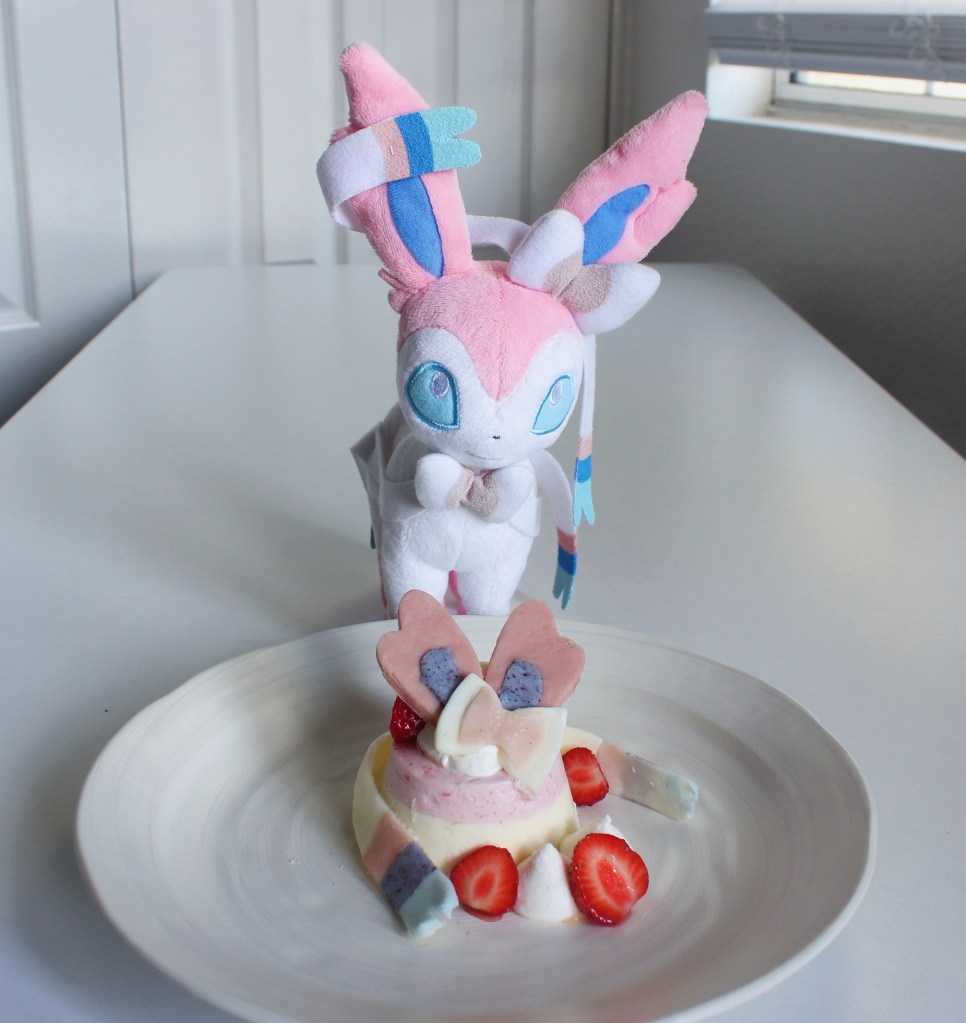 This was one of two desserts I got to create for The Pokemon Company when they contacted me for an opportunity to make dessert content for them to promote the Pokemon Scarlet and Violet World Championship series for 2024! This was a total dream come true for me, between having done Pokemon content in the past, but also because I literally grew up being the biggest Pokemon fan – literally ask anyone I grew up with, if there was anything they knew about me, it was that I love Pokemon. The prompt I got was to create desserts inspired by Sylveon, Comfey, Gimmighoul, Wattrel, or Riolu, and I had to film two reels and two stories for them! Of the options listed, I knew right away that I could do Comfey, since it was a cute Pokemon with a simple design that translates well into pastries and desserts, especially the ones that I make. With the other Pokemon, that was where things got tricky at first. Initially, I was going to go Gimmighoul and make Gimmighoul coin shortbreads, since any Pokemon player can relate to the pain that is collecting 999 of those bloody coins. But, and this might be a bit scandalous, I actually did not own a Pokeball-shaped cookie cutter, and to make Gimmighoul coins, I would actually need one. Then there was the issue with the Pokeball shape being indented into the coin, not etched on top, so it just became too convoluted to do for me at least. So instead, I decided to go with the Pokemon on that list which I actually love the most, and went with Sylveon! Sylveon, or Ninfia is it is called in Japanese, is the most recent(which is crazy since it was revealed 11 years ago) Eeveelution, being a Fairy-type mammalian Pokemon with pink and white fur, and these white-pink-blue ribbons that adorn it. I actually was gifted a Sylveon doll(pictured at the bottom of this recipe post) back in freshman year of college by my dear friend Lulu, who said I gave that kind of energy(I guess she knew I was gay before I came out, which just shows what a perceptive person she is!). While my favorite Eeveelution will forever be Umbreon(even though they would not let Umbreon learn Payback in Scarlet and Violet and that broke my heart since Curse-Payback Umbreon is my absolute favorite thing to use next to Scald Milotic), Sylveon is my second favorite Eeveelution because it is pretty viable competitively between its typing and near-broken Pixilate-Hyper Voice combo. In case you couldn’t tell, I actually used to play Pokemon competitively before I learned how to bake. So, going with my heart here, I opted to make a Sylveon-themed dessert!