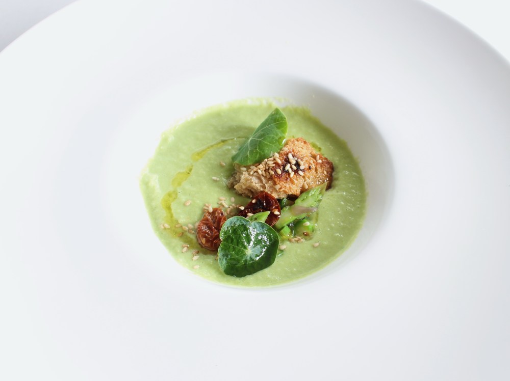 Garnish the soup with the asparagus tips, the sun dried cherry tomatoes, the crouton, some olive oil and sesame seeds, and finally the nasturtium leaves to finish.