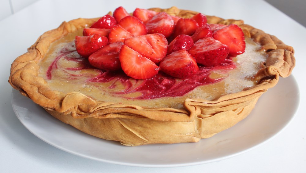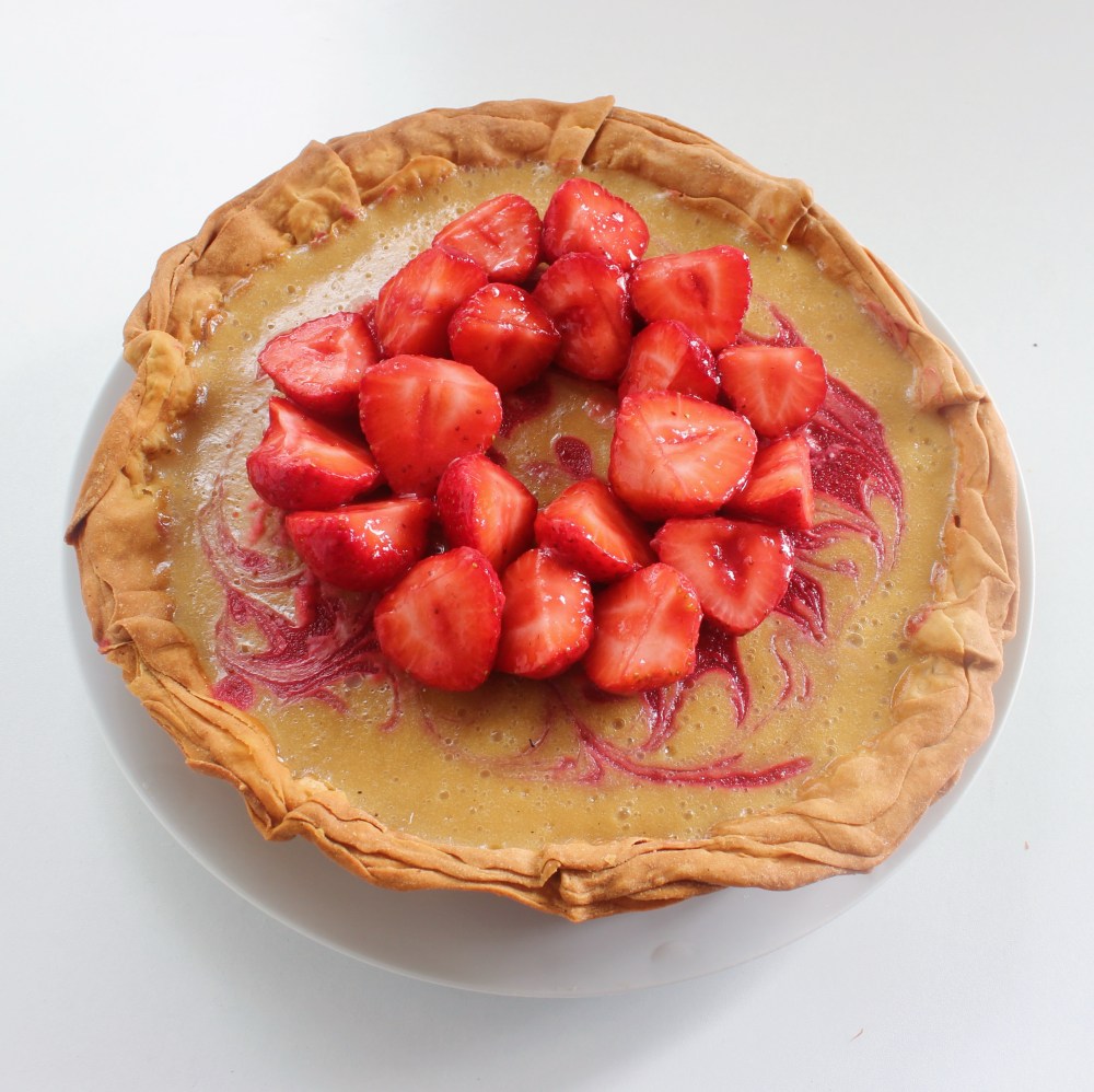 This phyllo pie is a variation on the apricot one I made a bit ago, this one featuring flaky homemade phyllo, Strawberry Inspiration coating, soy milk custard, strawberry gelee, and glazed strawberries on top. I have really fallen in love with the flaky phyllo fruit pies, because the filling is so interchangeable, as is the fruit being featured. I love that this is the kind of dessert where you can switch out those components depending on seasonality, and fall in love with it all over again. I am already imagining doing another version of this pie, but with pastry cream, caramel, dulcey(blonde chocolate or caramelized white chocolate), and apples, and possibly a maple-pumpkin-Almond Inspiration one for the fall. The components are fun and simple – flaky, buttery phyllo dough that is brushed with chocolate so that the dough stays crispy, a creamy, custard-y filling, and some sort of fruit component that will add acidity, freshness, and contrast the richness of the other components. In the case for this recipe, I landed on soy milk and strawberries. This recipe was made for my friend Sylvie’s birthday, as she loves strawberries and pie. I had made a strawberry-rhubarb pie for her a year ago, and while that was a hit, and I wanted to do a different take on a strawberry pie, going with something lighter that could be served cold, since her birthday is during the summer and a warm dessert, while comforting, could be a little harder to stomach in 90+ degree F weather. So I went with this pie instead!