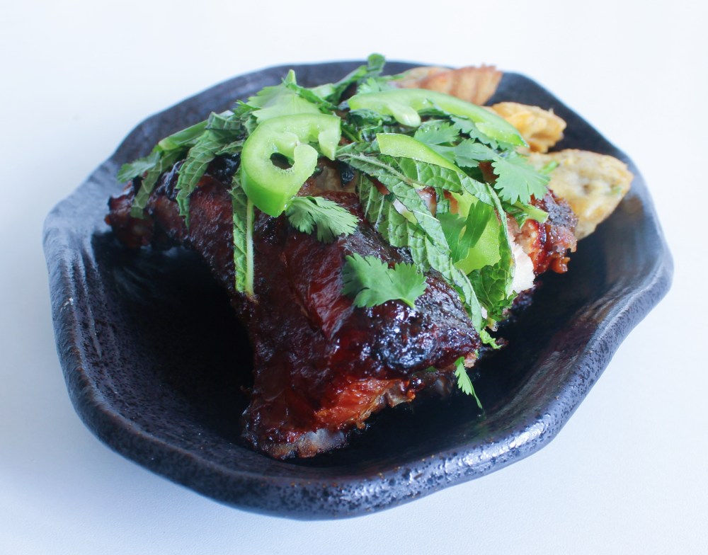 Garnish the top of the ribs with the herbs and chilies. Serve with a lime wedge to finish.