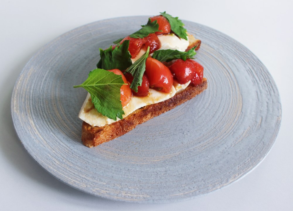 So I have made an extremely similar iteration of this recipe not too long ago using black mission figs – this recipe uses the same bread dough and the sweet and savory miso-ricotta spread, which I am obsessed with. But this time around, I wanted to use Momotaro tomatoes. Momotaro tomatoes are these light pink tomatoes that are popular in Japan, and also grow here in Southern California as well. I love them for their sweetness and mild tart notes. One of my personal favorite memories with the Momotaro tomatoes was at a now-closed Japanese restaurant in Costa Mesa, where they made this Japanese styled carpese salad with them and shiso(basically Japanese mint) instead of basil. That restaurant was called “Masa” and it served so many unique Yoshoku(Western-styled Japanese cuisine) dishes that I came to love. From this braised beef tongue stew to a delicious cheese-stuffed cabbage to that Momotaro tomato caprese, so many dishes that really invoke so many fond food memories for me. The reason why Masa closed was because the chef/owner, chef Masa, did not want to be his own employer anymore, which was a shame, because his food really was quite tasty. And for that reason, we are essentially recreating chef Masa’s Momotaro tomato caprese salad, but replacing the mozzarella with Meiji tofu(think freshly made, silky, custardy, but almost sweet tofu that is very similar to a freshly made ricotta or mascarpone in flavor), compressing the Momotaro tomatoes into little faux cherry tomatoes, and pairing that with a tangy ponzu-like marinade instead of balsamic, and using some fresh shiso as a garnish. This recipe eats quite savory thanks to the tomatoes and ponzu, and invokes a dish that I grew up loving to eat.