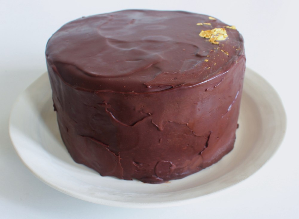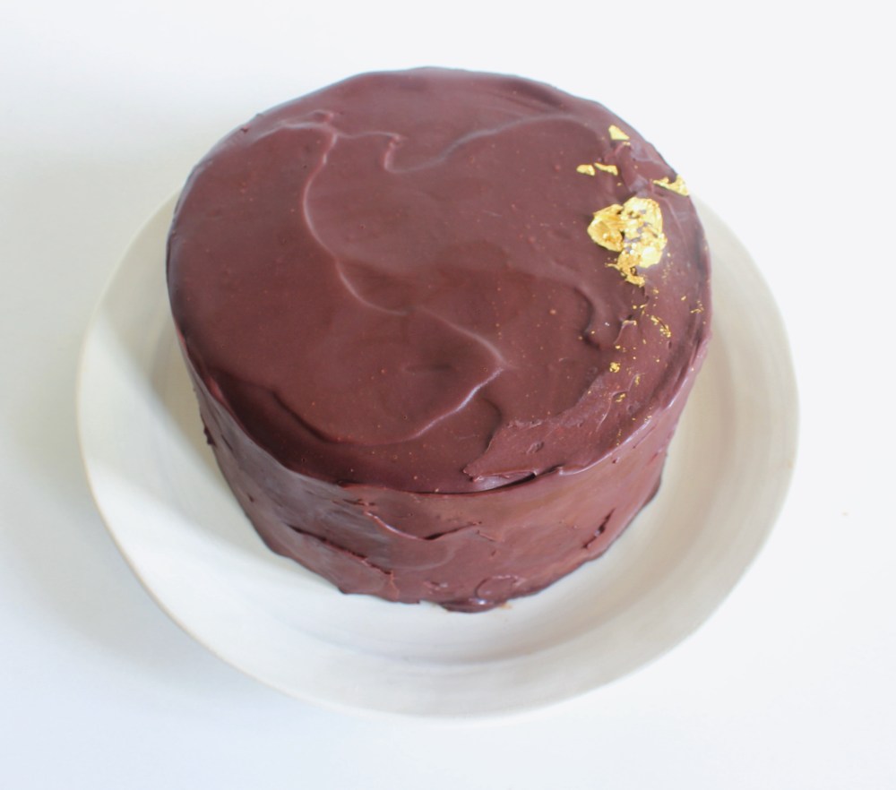 Start by spread the whipped ganache around the cake to form your crumb coat. Freeze the cake again for another 20 minutes – you want the cake to get as cold as possible. With the remaining ganache, melt that down either in the microwave, heating it in 1 minute intervals until it is a pourable consistency, or over a double boiler in a heatproof bowl. Pour the still-warm ganache over the frozen solid cake, spreading it so that it coats the cake. Garnish the top with the gold leaf to finish. Transfer the cake to the refrigerator or freezer until the ganache is firmed before placing on your desired serving surface.