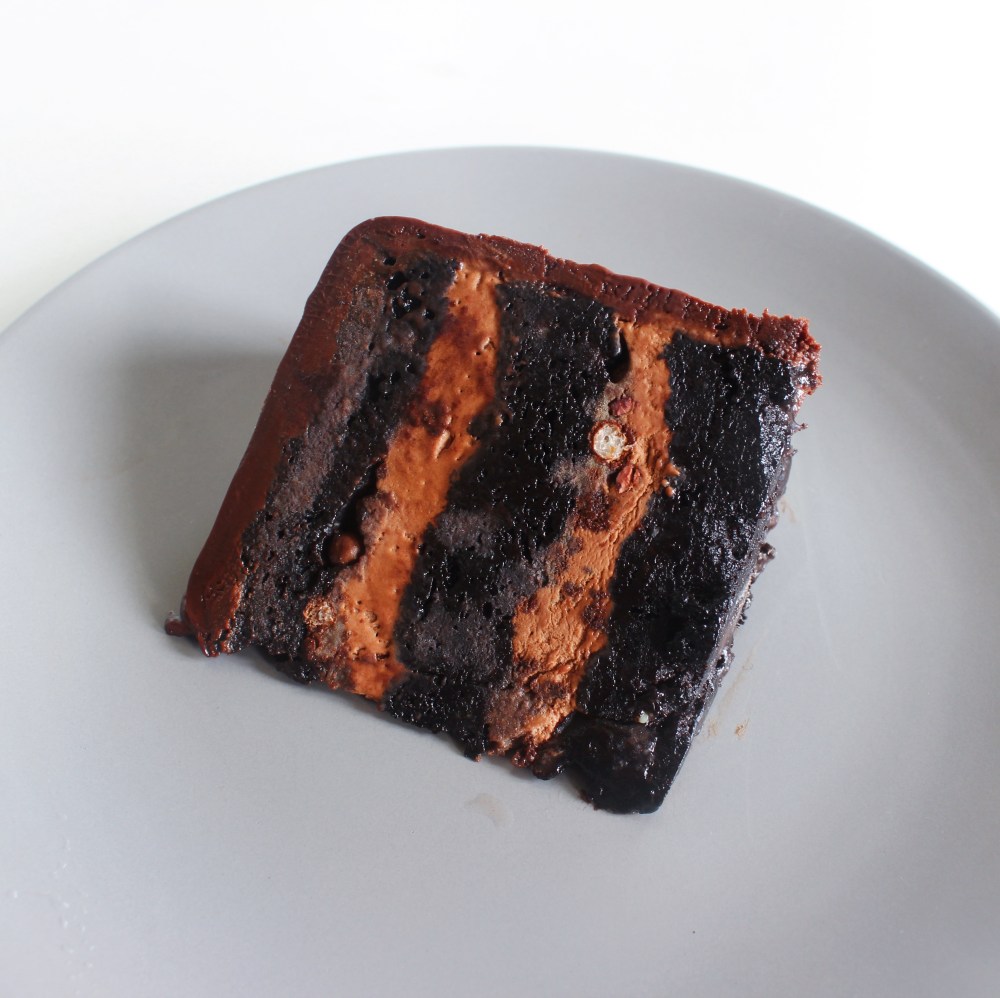 I am a firm believer that there is a chocolate cake for every occasion. The best occasion for this kind of recipe is if you want a chocolate cake that tastes like baked fudge. Now I have been mentioning the Ms. Trunchbull Chocolate cake a bunch of times on this blog, but this is very, very close to what I was hoping for. Hilariously enough, the secret to making this recipe was right under my nose the whole time. It happened when I played around with my cake ratios, adding more sugar and oil, and less flour than I normally would, and the end result was almost like a brownie. The cake was dense, rich, gooey, and ironically enough, did not contain any actual chocolate, but rather, cocoa powder. I used a black cacao powder because I just love the look of the final cake, being rich and inviting with that intense chocolate flavor. Black cacao is an alkalized or Dutch-processed cocoa, resulting in an almost fruitier chocolate experience – fun fact, Oreos use black cacao to achieve their iconic color. I learned about black cacao while I did R&D at Milkbar, because it was in our pantry – we used it in the chocolate soft serve, and after tasting and baking with it, I could see why. It was delicious in the chocolate-passionfruit cookies I made then, and it is just as delicious in this decadence layer cake that I made now. With the other components, we have a chocolate mousse that is light as air, an Ovaltine soak, crunchy chocolate pearls, and a chocolate ganache coating. If you love chocolate, this cake is for you. If you hate chocolate, then turn away now, this recipe will be your nightmare.