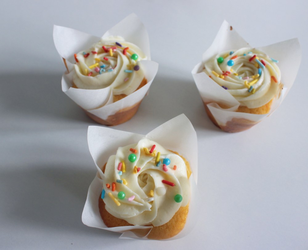 Pipe the buttercream on top of the cakes and garnish the top of the cakes with the sprinkles.