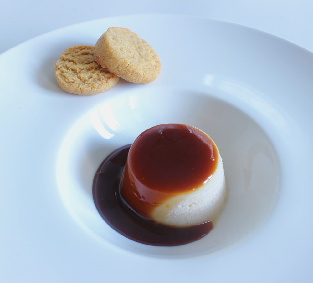 For the components, we have a miso and Meiji tofu panna cotta, kinako-almond cookies, and soy-salted caramel. Three components, each with their own little challenges. With the panna cotta, since we are using tofu in the recipe, setting and unmolding these can be very tricky. If you freeze anything that is set with tofu, what will happen upon thawing is that the liquid will leech out, leaving your panna cotta or mousse a shriveled lump sitting in a pool of mystery water. The same thing can happen with yogurt too, and the gist of it is that when you freeze soft tofu or yogurt, the ice crystals from the liquid in those ingredients expand and break out from the solids, so when it thaws, that is why the liquid pools at the bottom of any frozen then thawed yogurt or soft tofu. I recommend oiling the sides of your molds and if you have either glass or metal molds, use those. I made the mistake of using a silicone muffin tin and the end result was…mostly a mess. Let’s just say I got one good panna cotta and the rest, I wound up blending up and pouring coffee over it to make myself a miso-Meiji tofu latte. The benefits with using a glass or metal mold is that you can submerge the exterior of the molds in hot water, after the panna cotta is set, and then the panna cotta becomes a lot easier to invert onto a plate or bowl. With the cookies, since they lack gluten and butter, the dough itself is quite delicate and temperamental. The longer you refrigerate or freeze the dough, the easier it is to work with, so just keep that in mind. With the caramel, it can be hard to caramelize soy sauce, since more often than not, you are looking for when the white granulated sugar turns an amber-brown color to indicate caramelization, but with soy sauce already being an amber-brown color, or in some cases, even darker than that, a sense of smell, coupled with a laser thermometer, become more vital for successfully caramelizing the sugar. So while the dessert is just three components, each can be very technical, but when executed well, you have a very tasty dessert on your hands.