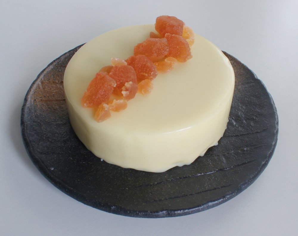 To glaze the cake, place the still-frozen entremet onto a slightly raised surface(like an upside down deli cup or an icing rack) and then pour the mirror glaze onto the entremet. Allow the glaze to set around the cake before garnishing the top of the cake with the kohakutou to finish.