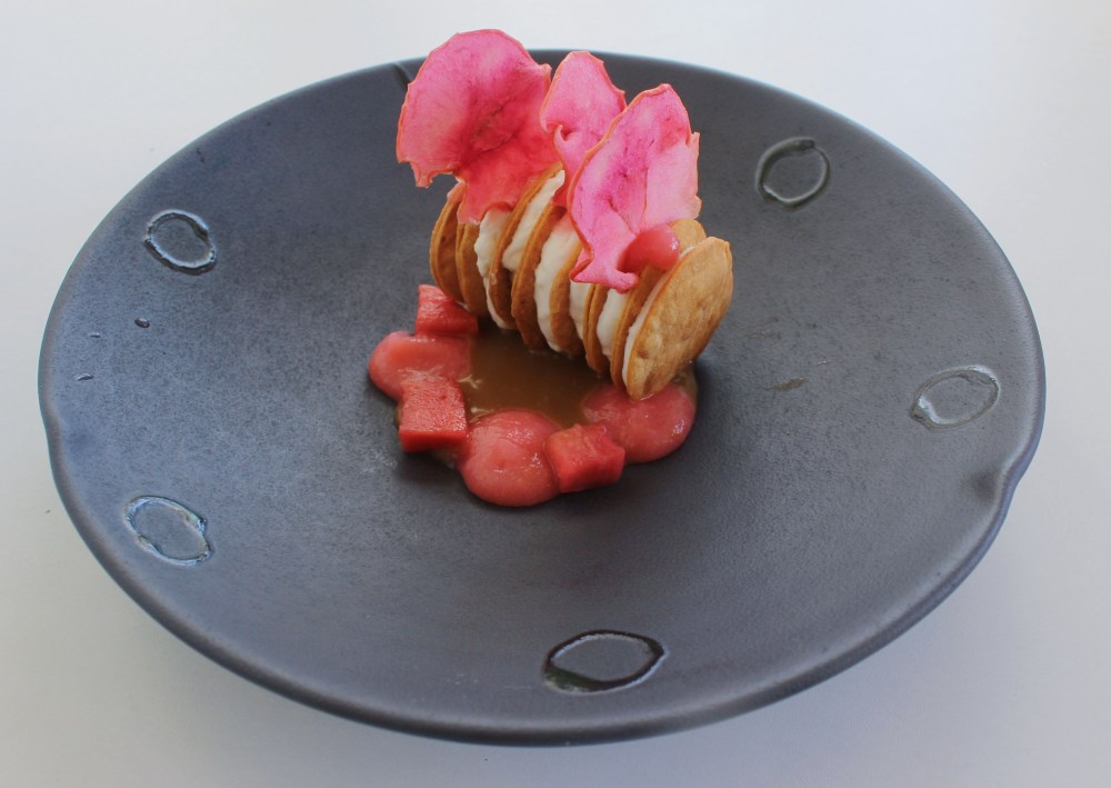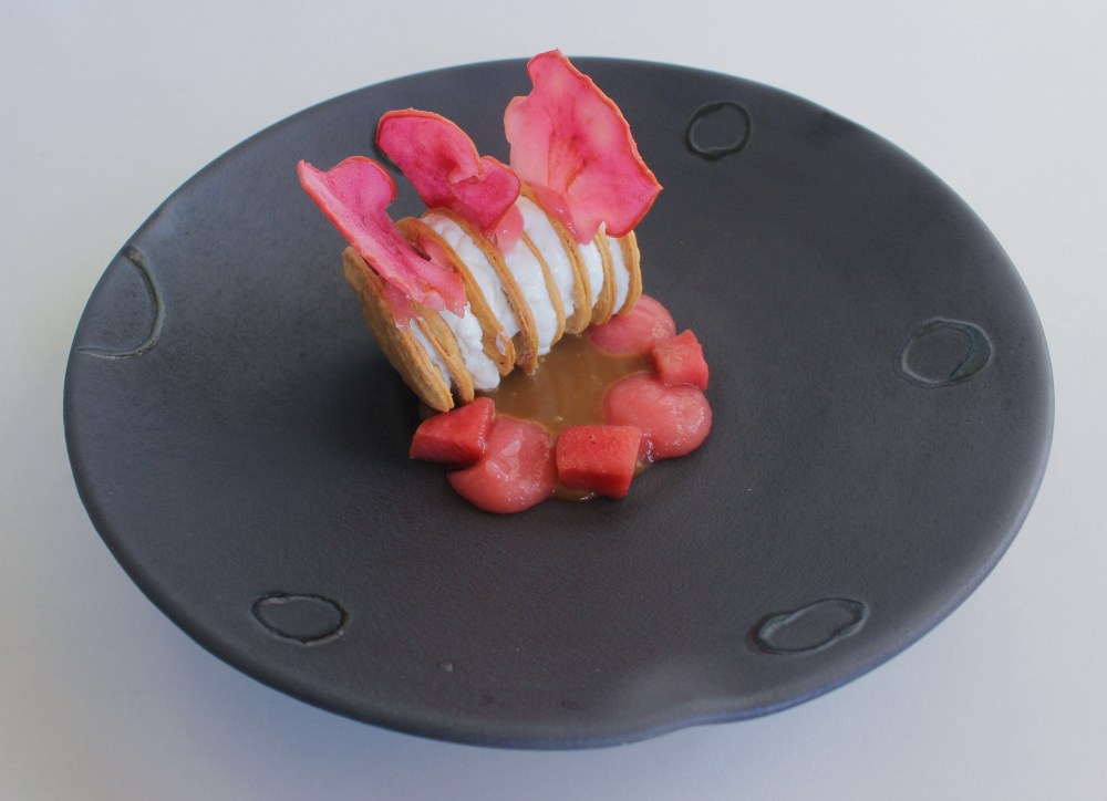 In terms of the techniques for this krempita versus the original, there are mainly two differences(you can read about the notes I had on the other components in the original recipe). The inclusion of the hidden rose apple chips, and the inclusion of the pink apple fluid gel. The fluid gel is not super difficult to execute, with the main thing to focus on being the consistency – using a blender, preferably a stick blender, is very important, since that is the best way to achieve a smooth, pipeable texture in the gel itself! I used a little lemon juice in the gel for two reasons – to tone down the sweetness in the gel, and to bring out a more vibrant pink color from the apples by lowering their PH level. The science behind it aside, so long as you have a stick blender, the fluid gel comes together really quickly. The chips, on the other hand, are what might be the single most time-consuming component in this recipe. I have used this technique before on various other fruits, but the gist of it is that you lightly heat up thin slices of apple in a syrup, then bake those slices, low and slow, until all of the liquid is cooked off, resulting in semi to fully-translucent fruit chips that you can garnish on top of any dessert. It is a really cool and fun technique that I wanted to employ for this fruit-based dessert, just as another way to highlight the natural color of the hidden rose apple!