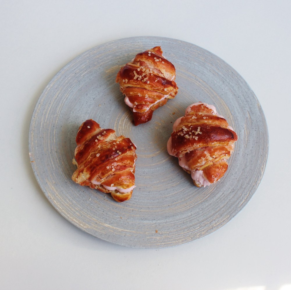 I did not have it in my 2024 bingo card that I would be making croissants again. The last time I tackled croissants this frequently was 4 years ago during the pandemic, when there was literally nothing else to do. Croissant dough usually takes a long time to make, since the dough is laminated, but also yeast-based. The TLDR of it is that the dough is temperamental, unforgiving, and even with fast-tracking, can take upwards to 6 hours to prepare. But for Pinktober, I wanted to have something cute and pink(and red-ish), so that was how I came about with this recipe! This dough is a modified version of the recipe my dear friend, Samantha Daily, gave me when we were making croissant supremes for Valentine’s Day. I reduced the quantity, and her recipe used fresh yeast, so I converted that to dry yeast. Additionally, I added red beet powder to a portion of my dough so that there was a pleasant red stripe running through my dough, and unlike a normal croissant, where you laminate the dough using a butter block, I went with a method similar to phyllo dough, layering up rounds of dough with brushings of butter. It comes together relatively quickly, and you still have the same flaky layers that you would get from traditional dough lamination! The filling was a red currant cheesecake situation, made by whipping cream cheese with red currant jam I got during my most recent trip to Germany! These croissants were adorable to look at, and finished with some Indian rock sugar for a glittery touch.