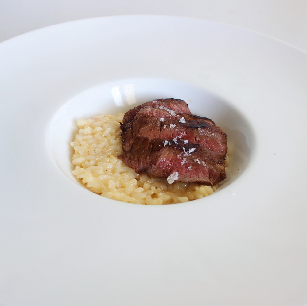In a bowl, start with the risotto, then fan out on top of that the beef heart slices, and finish with some maldon salt.