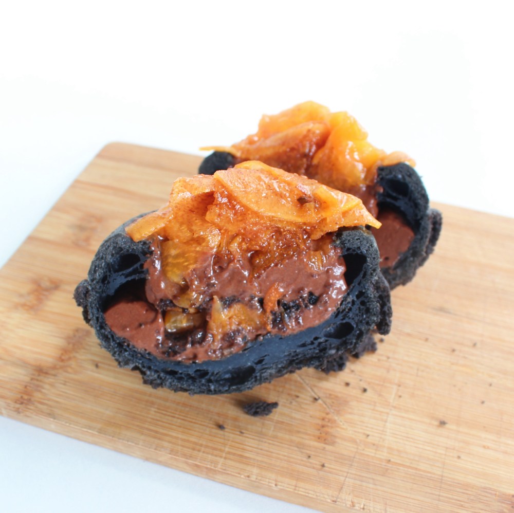 Start by cutting out the soft bottom portions of the cream puffs, allowing the craquelin side to become the new bottoms of your “cauldrons”. Pipe roughly .5oz of the ganache into the new bottom of the choux. Then place down one round of the cake, .1oz of the shaved persimmon, then another round of the cake, another .5oz of the ganache, and arrange more persimmon on top. Finish with the tempered chocolate handles.