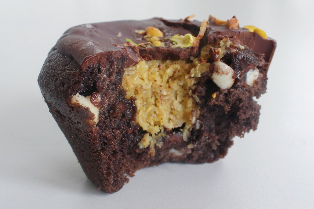 In a bowl, whisk together the sugar, olive oil, egg, coffee, and vanilla. In another bowl, sift together your flour, ground pistachio, cacao powder, baking powder, baking soda, and salt. Then toss the chocolate chips through that, just to coat the exterior of the chips with the flours – this will help prevent the chocolate chips from sinking as the muffins bake. Fold everything together to form your batter. Split the batter between 6 lined muffin tins. Bake the muffins at 350 degrees F for 20 minutes, rotating the pan by 180 degrees halfway through the baking process. Allow the muffins to cool before attempting to remove from the muffin tin.