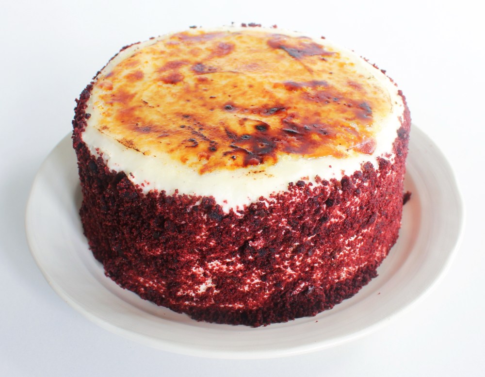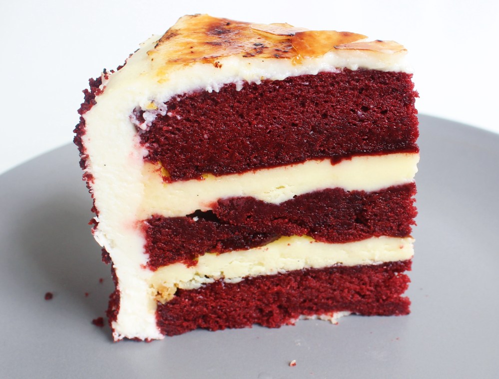 This red velvet cake combines together a few fun desserts, being obviously red velvet cake, but also cheesecake, and creme brulee. I have been obsessed with doing these baked cheesecakes with bruleed sugar tops – these kinds of cheesecakes are similar to a basque cheesecake, but instead of the top being burnt, it is a bruleed sugar top for a cracklier texture. So to pay homage to that, I made layers of white chocolate baked cheesecake, and sandwiched that between layers of soft red velvet cake. I enrobed the entire thing in a white chocolate-cream cheese namelaka(whipped ganache-mousse), and bruleed some sugar on the top to give it a crackly finish. I have a highly hypocritical opinion about red velvet cake. Conceptually, it is a lot of what I was raised to stand against – artificial food coloring, not an actual distinct flavor(I like emphasizing flavors or ingredients, not muddling them), and I have had more than my fair share of bad red velvet cake. However, it is my go-to order whenever I try a new bakery. Simply because it is so against my personal baking philosophy that if I like the taste of your red velvet cake, it is a telltale sign that your baked goods are actually really good. Also probably the self-fulfilling cycle as to why I continue to be subjected to so many bad red velvet cakes that remind me of why I usually do not enjoy it. So what makes a good red velvet cake, might you ask? It needs to have enough cocoa powder in there that I can get a hint of chocolate. Red velvet is technically not a chocolate cake. But I need to still get the earthy cocoa notes, reminiscent of hot chocolate mix(Swiss Miss, anyone?). The cake itself also needs to be light and airy, but still moist enough that when I bite into the cake, it does not just fall apart into crumbs. And lastly, the color. The cake obviously needs to be red, but I prefer an elegant shade of scarlet or crimson. If it looks like a fire truck, it’s a no-go for me personally. I did a LOT of recipe testing with this cake, because I wanted perfection. And I got a lot of great feedback on this cake, from my friends and my own stomach, so I can confidently say that this will be one of the best red velvet cakes you can ever try.