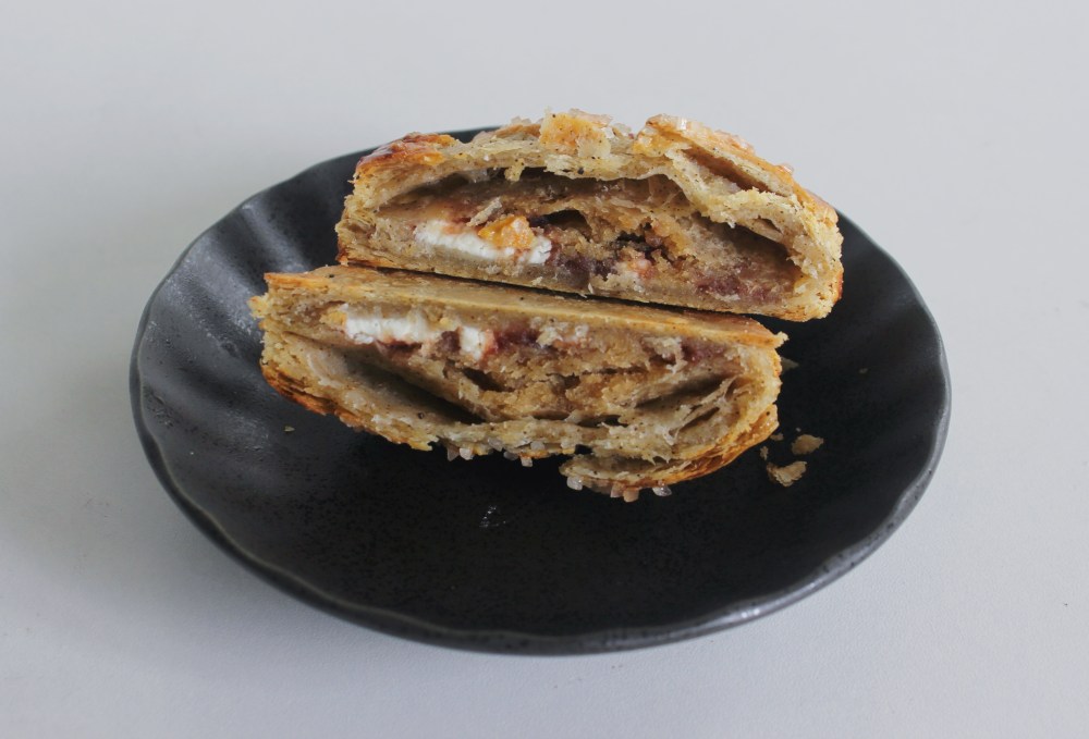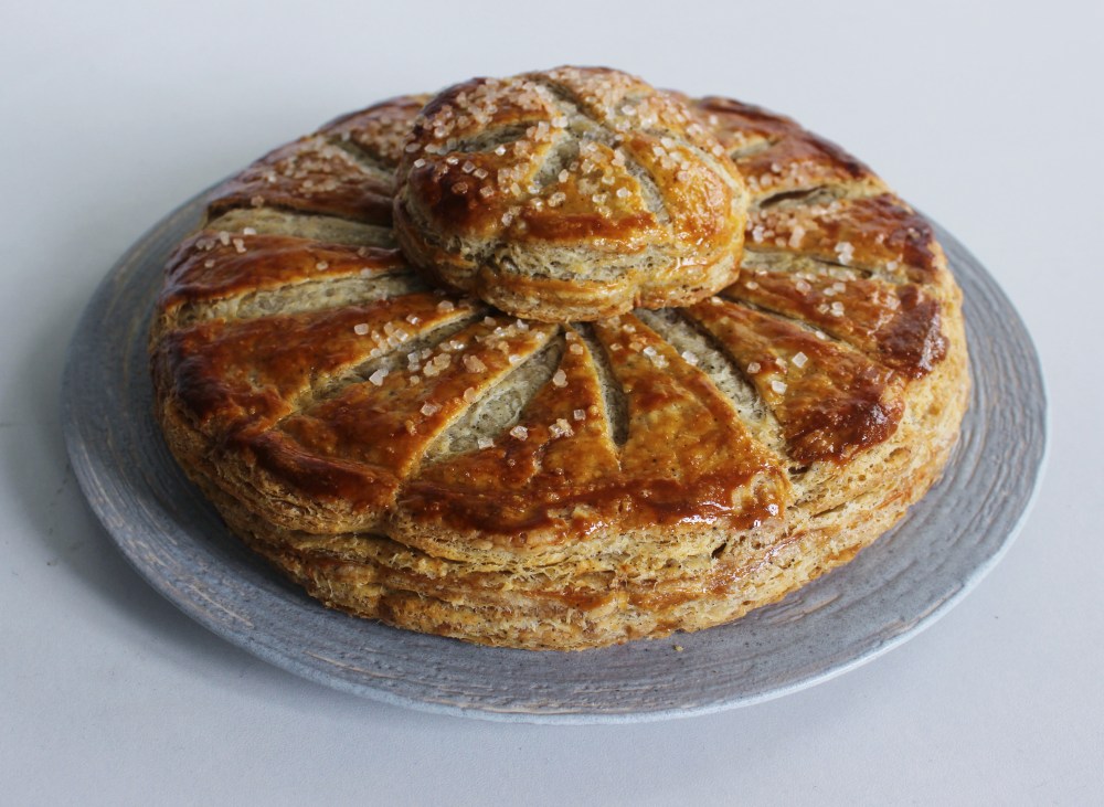 For this recipe, we have a black tea infused rough puff pastry, stuffed with an almond financier batter, red bean paste, and a layer of cream cheese. The idea here is that the cream cheese will provide creaminess and saltiness, the almond financier, being a brown butter spongecake, will add body to the pastry, and the red bean will be here for sweetness, on top of the financier itself. In terms of technical difficulty, a galette de rois is up there, but only if you make the puff pastry from scratch. If you do not, then it’s probably a 4/10 level of difficulty. Take your time with the rough puff pastry. Give it ample time to cool between folds, and do not try to fast track that process, or else your butter might melt and you will end up with shortbread instead of puff pastry! And while shortbread is delicious, it will not be light and flaky like puff pastry is. the financier dough requires some technical precision, namely in making brown butter. Besides that, the rest of the components are just being layered on top of the almond financier batter and sandwiched between the puff pastry prior to baking. Be sure to brush egg wash on top of the dough for that gorgeous golden-brown color, and not score the pastry too deeply with a paring knife, and you should be good to go! I was able to get this recipe done in 4 hours, which given how much of that time was spent making rough puff pastry, it not too bad. If you want to make the puff pastry one day, then assemble it all another day, maybe go that route too, just to break up the monotony.