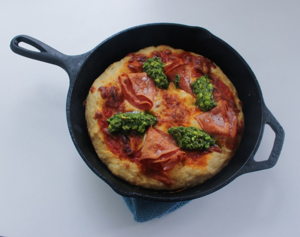 To assemble the pizza, roll out the dough to be roughly 10 inches in diameter. If using the cast iron pan, place the dough into the burning hot cast iron(be very careful when doing this). If not, transfer the dough onto a surface lined with flour(semolina flour or cornmeal works especially well here). Spread the sauce on top of the dough in an even layer and then layer on 4 slices of the mortadella first. Then sprinkle on top of that your mozzarella cheese. Then layer on top of that the remaining mortadella.
