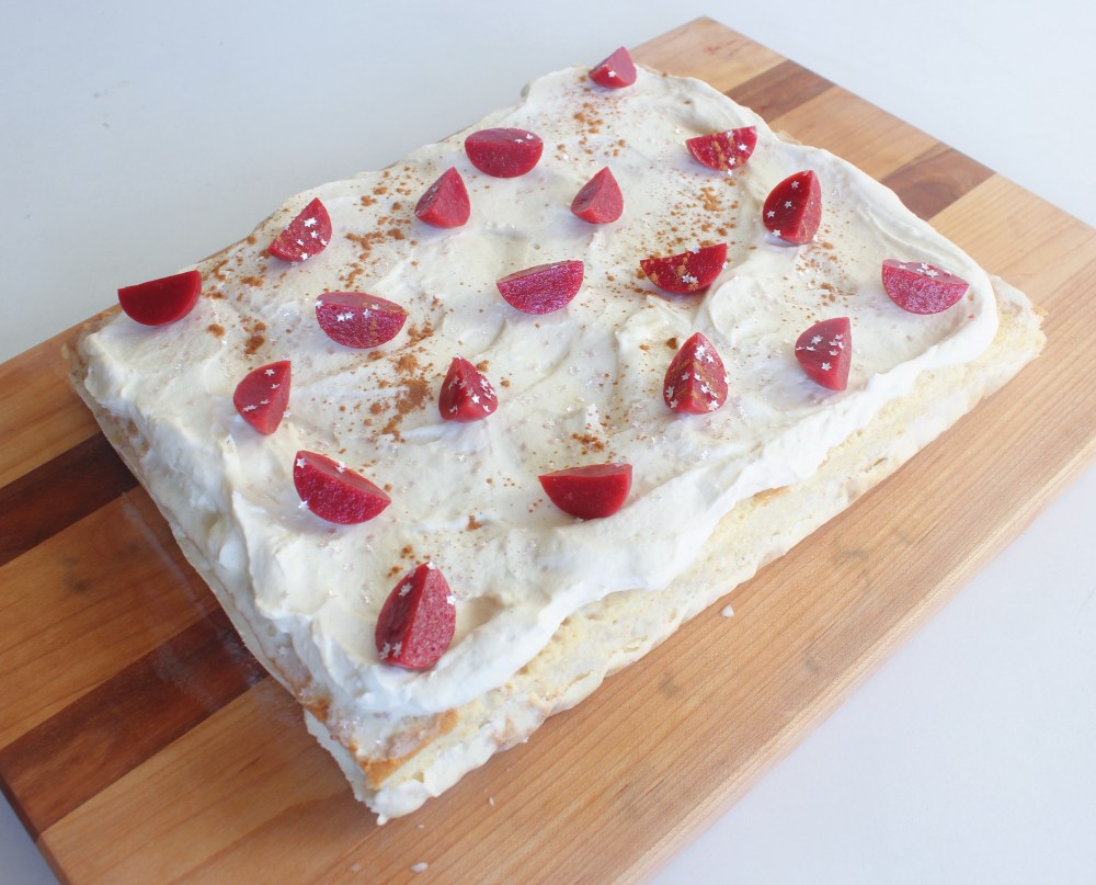 Spread the whipped condensed milk on top of the soaked cake and garnish with the ground cinnamon, the gelee, and star glitter to finish.